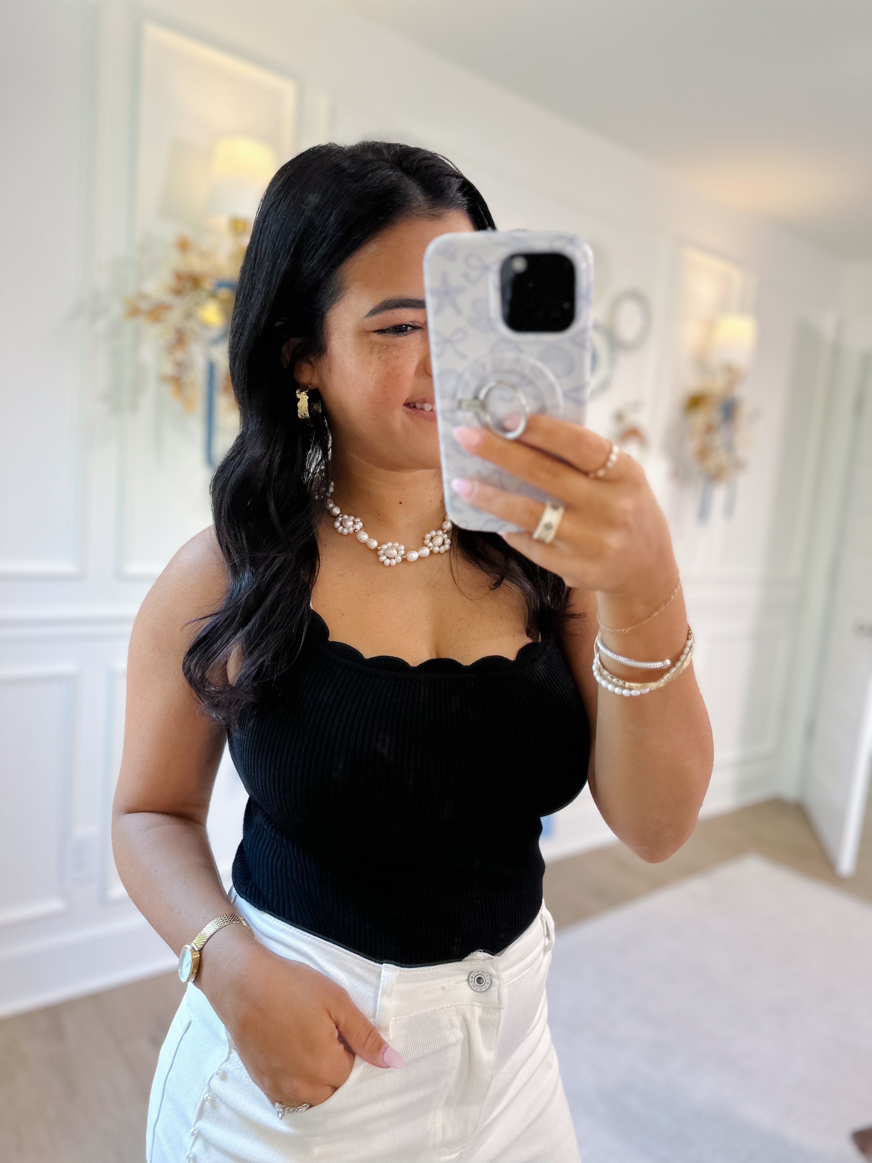 Elevate your wardrobe with our Audrey Bodysuit! This sleeveless, ribbed knit bodysuit features a solid neckline and exquisite scallop edge detail to add a touch of sophistication to any outfit. Available in classic black, this versatile piece will become your go-to for effortless, chic style.