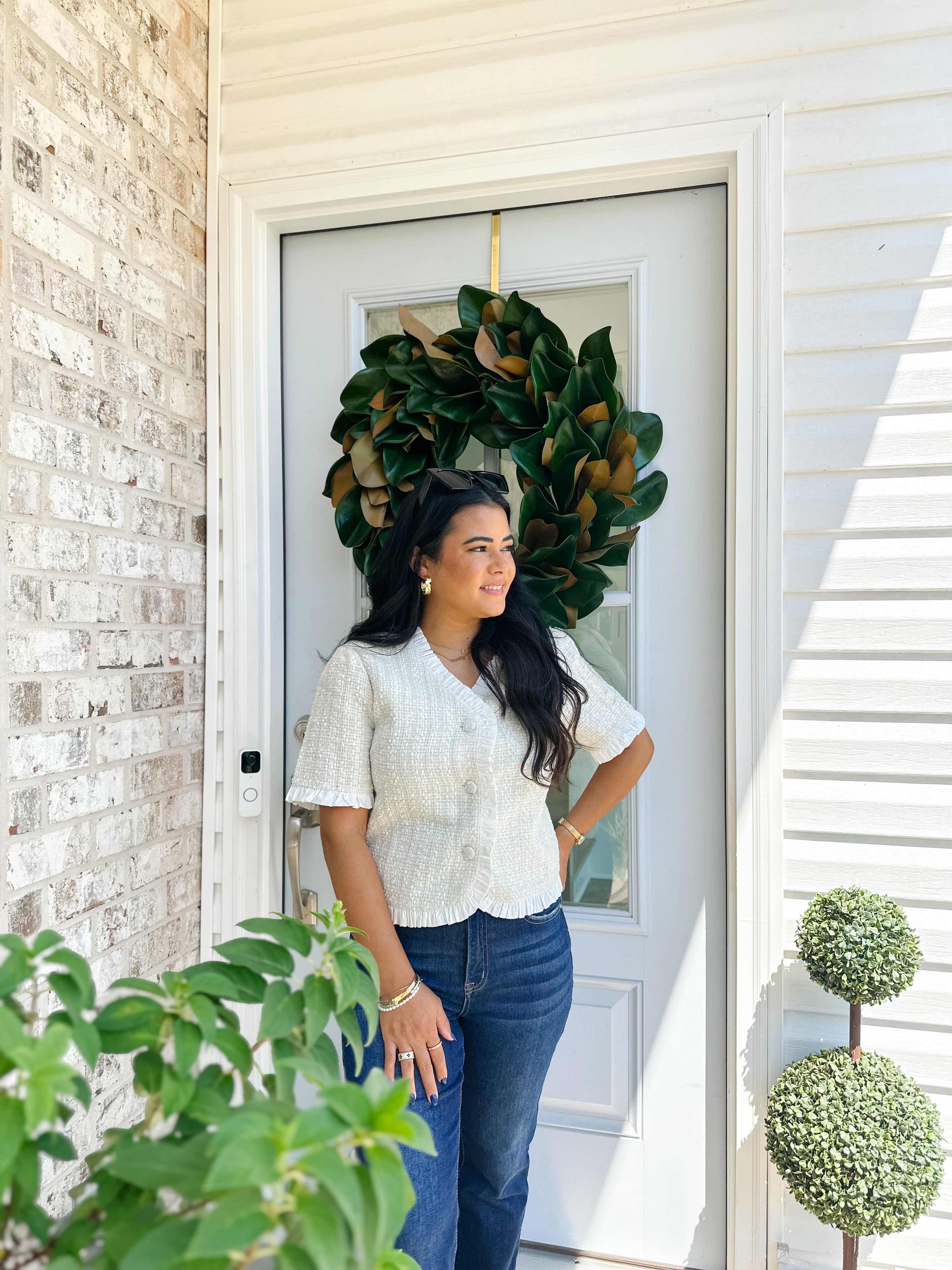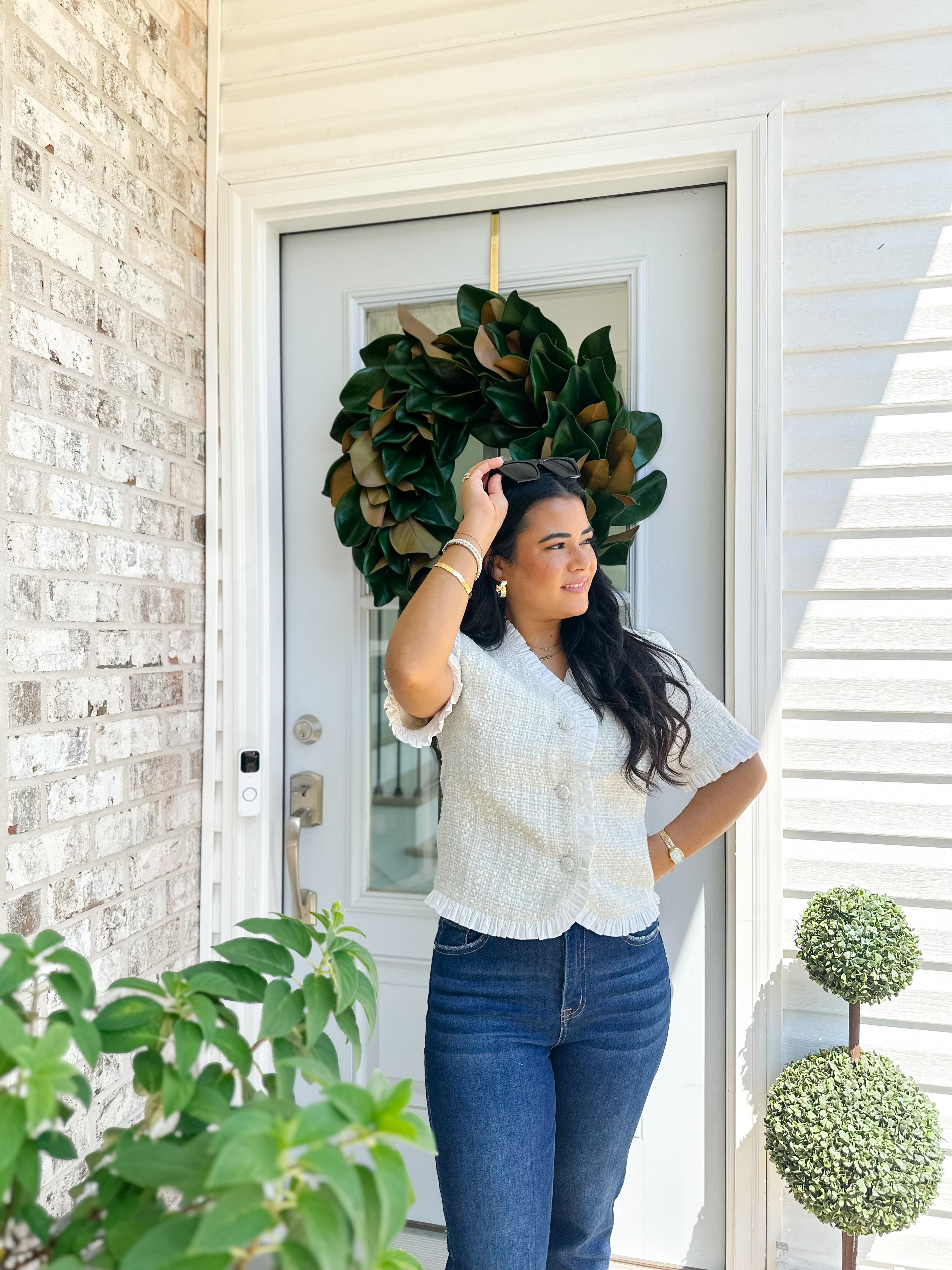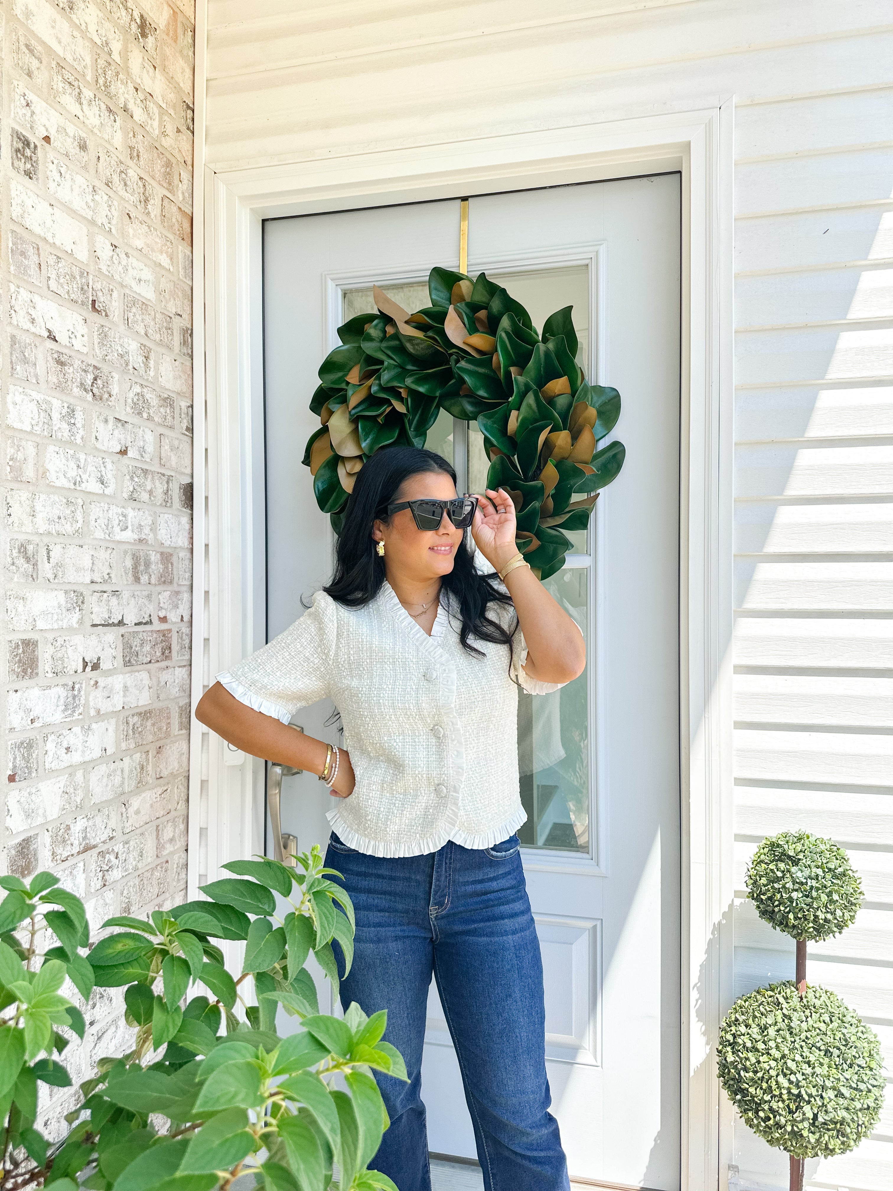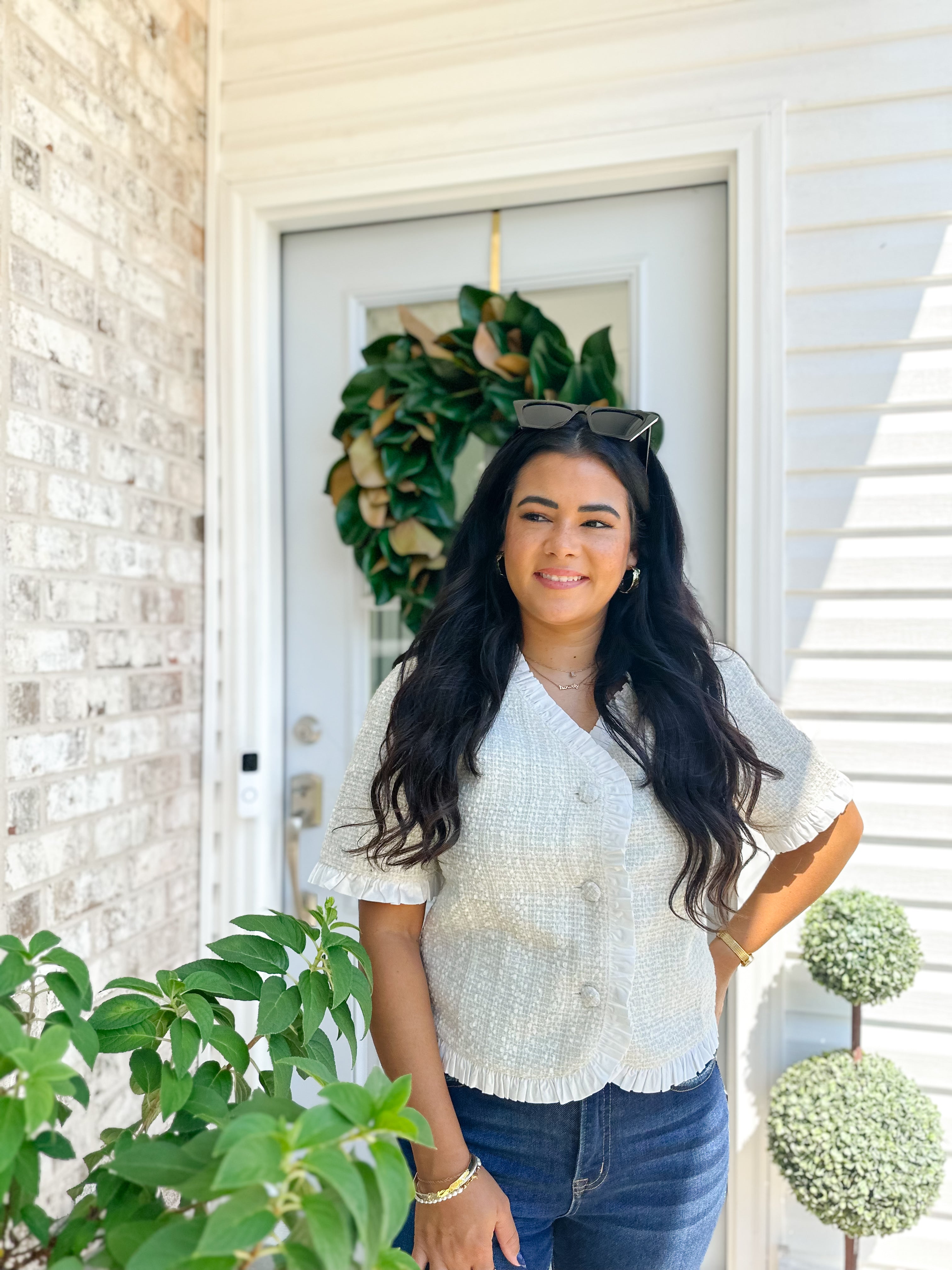 The Jackie Tweed Jacket is your go-to piece for polished layering. Designed in a timeless white tweed with a playful ruffle hem, this short-sleeve jacket is equally refined and versatile. Pair it with tailored denim, layer it over a dress, or wear it open for a chic, effortless look that feels at home from brunch to boardroom.