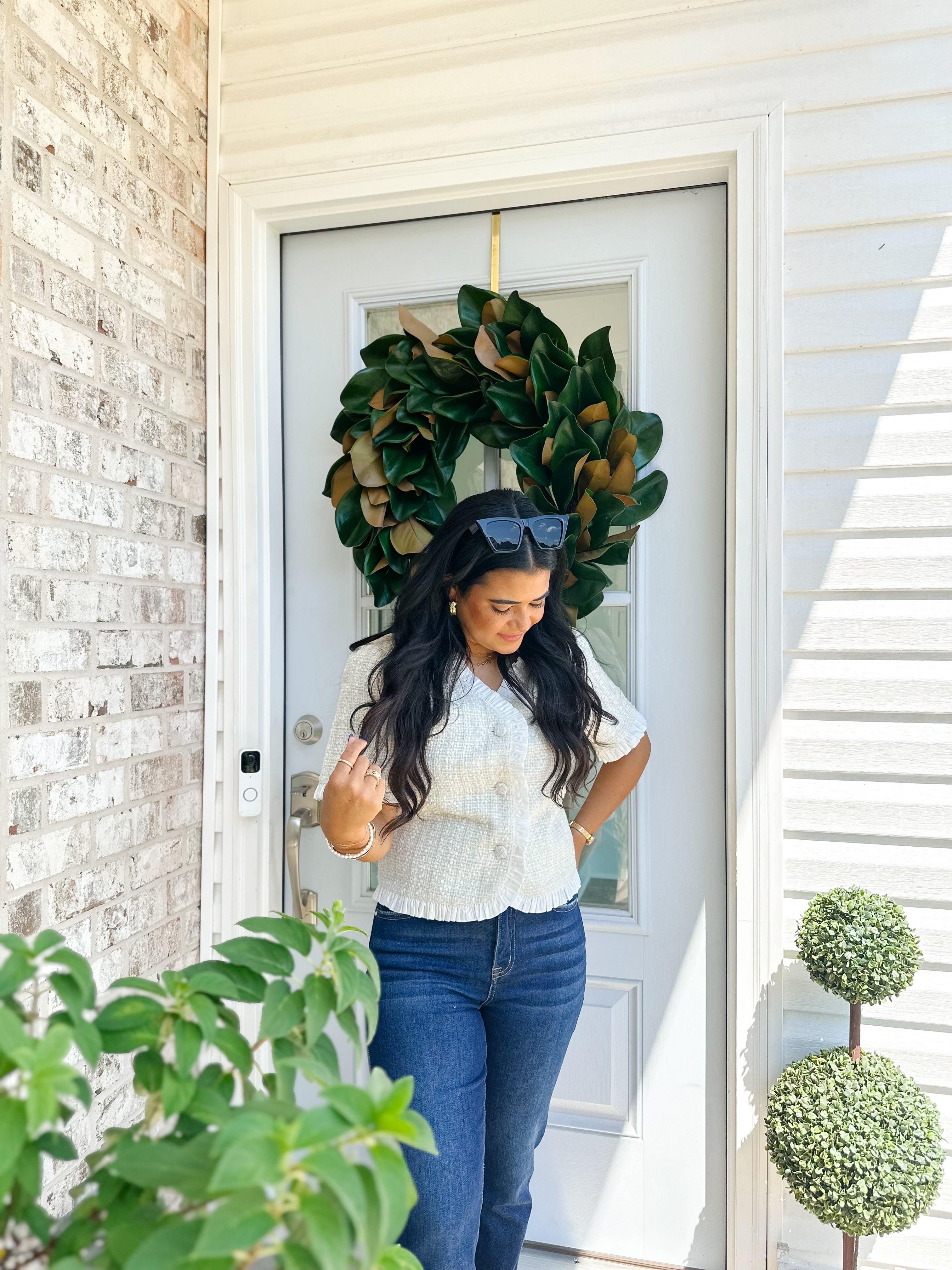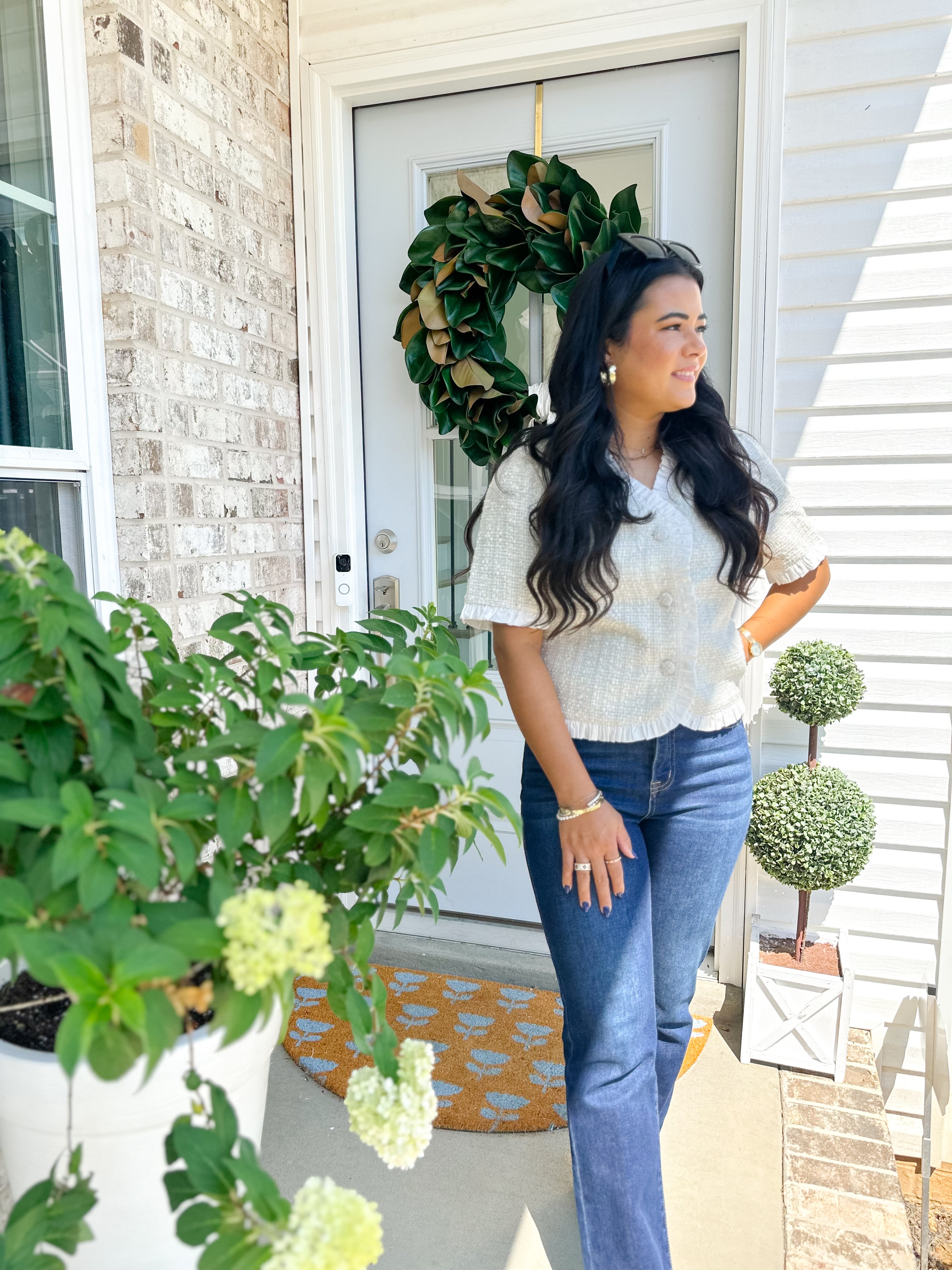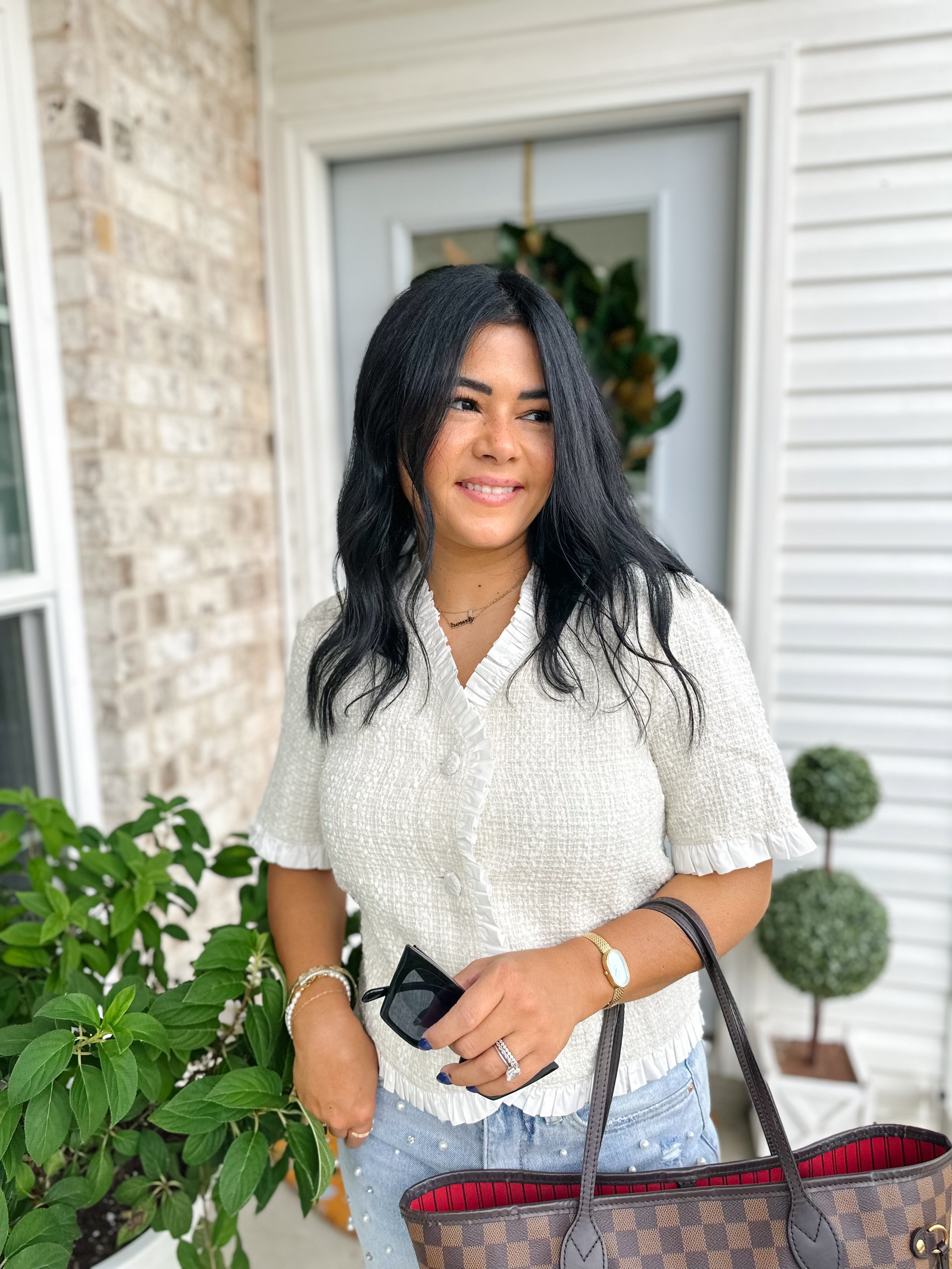 The Jackie Tweed Jacket is your go-to piece for polished layering. Designed in a timeless white tweed with a playful ruffle hem, this short-sleeve jacket is equally refined and versatile. Pair it with tailored denim, layer it over a dress, or wear it open for a chic, effortless look that feels at home from brunch to boardroom.