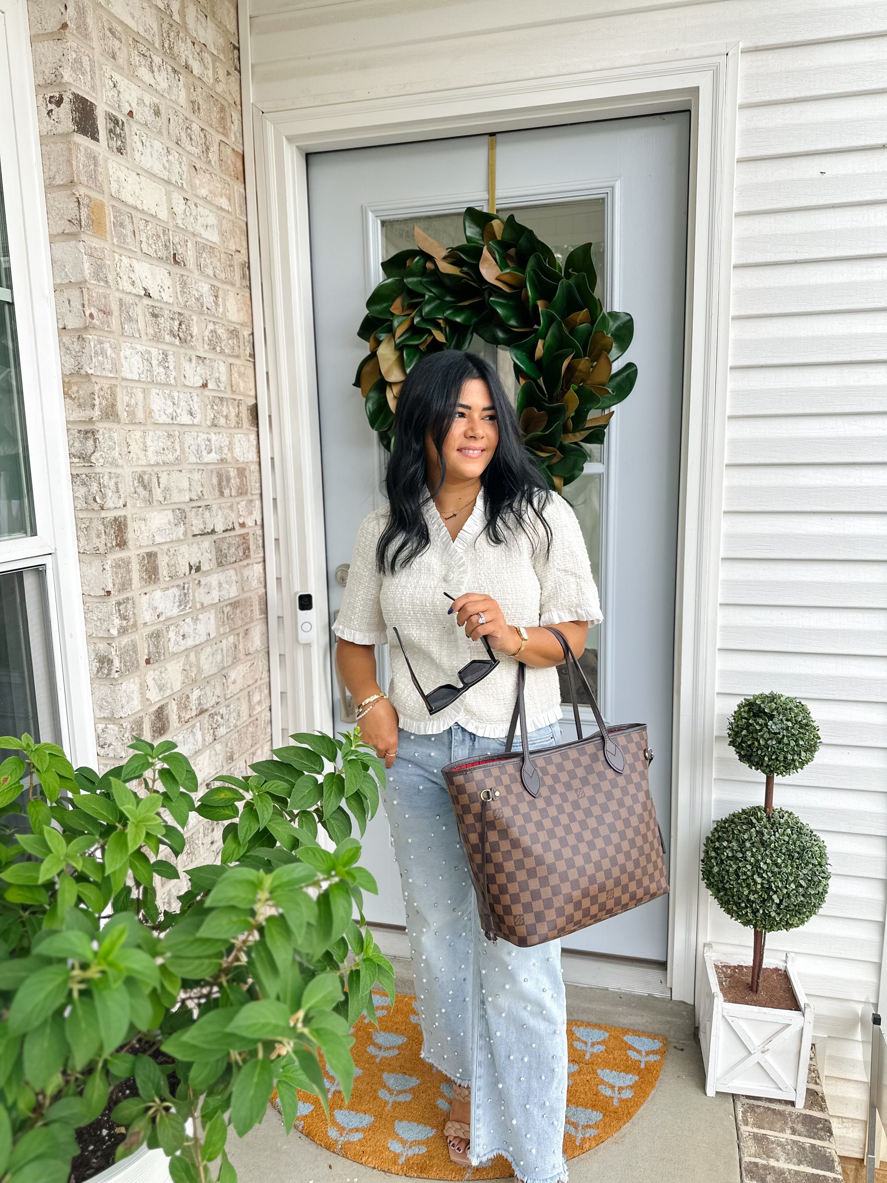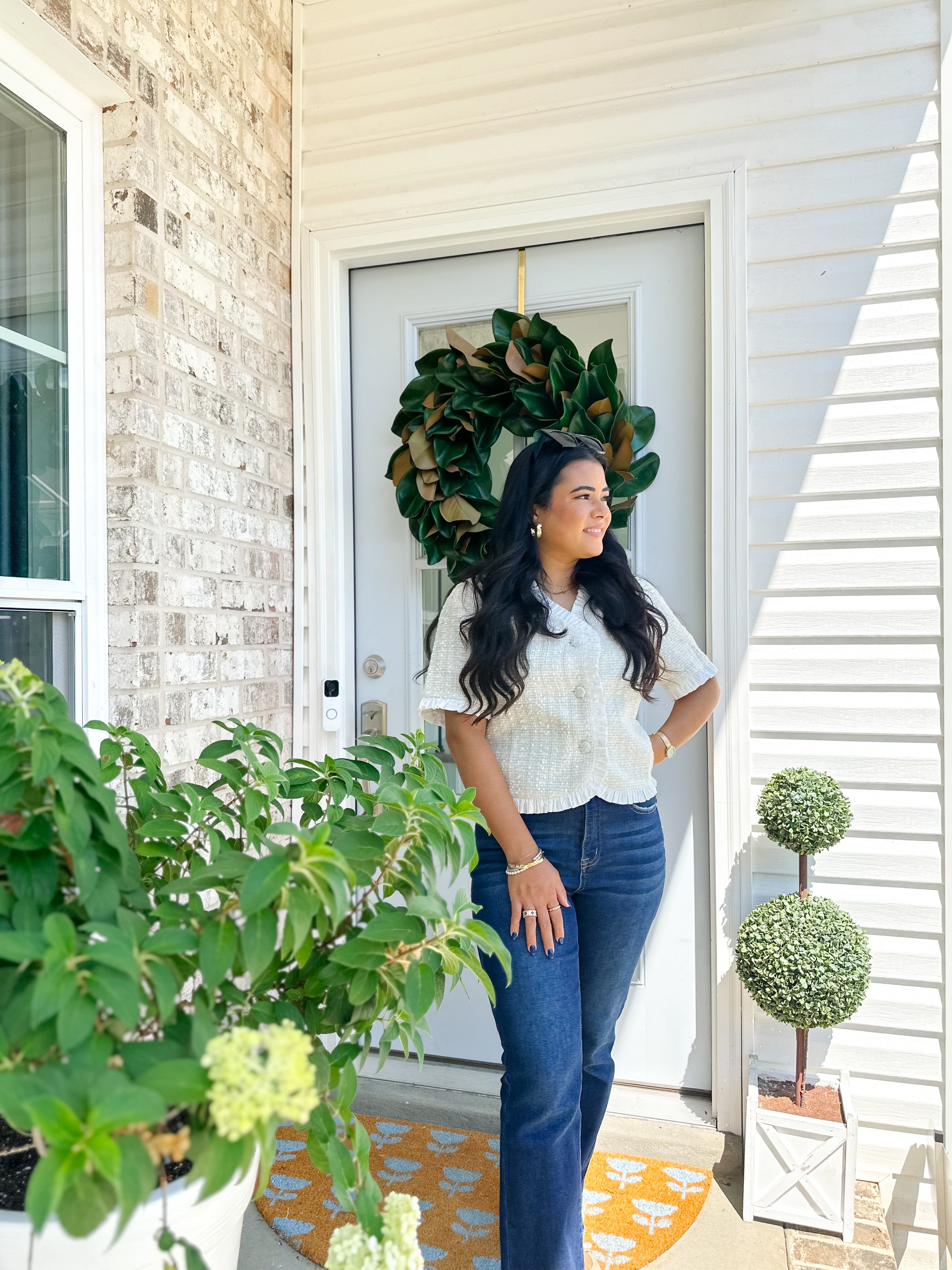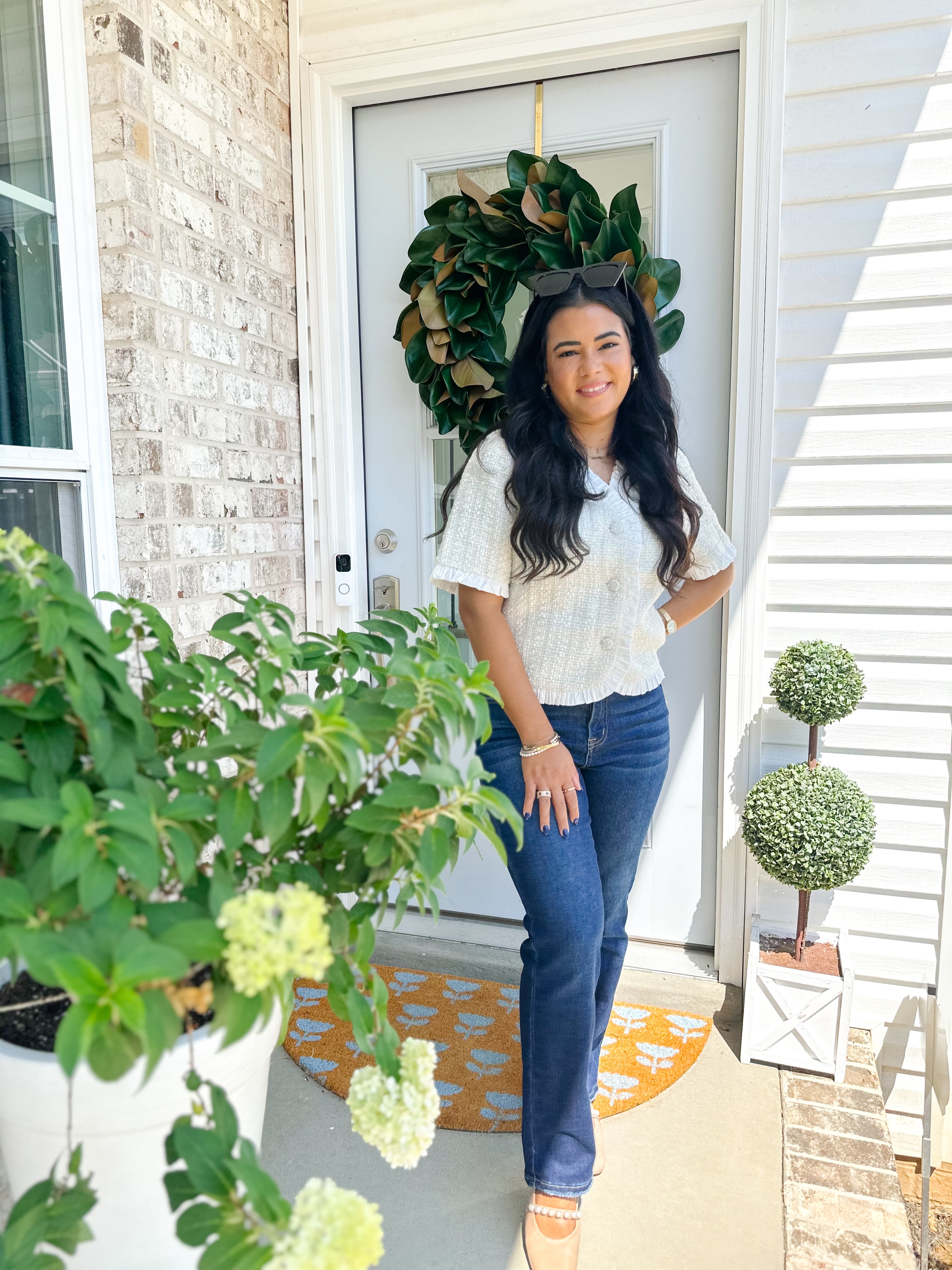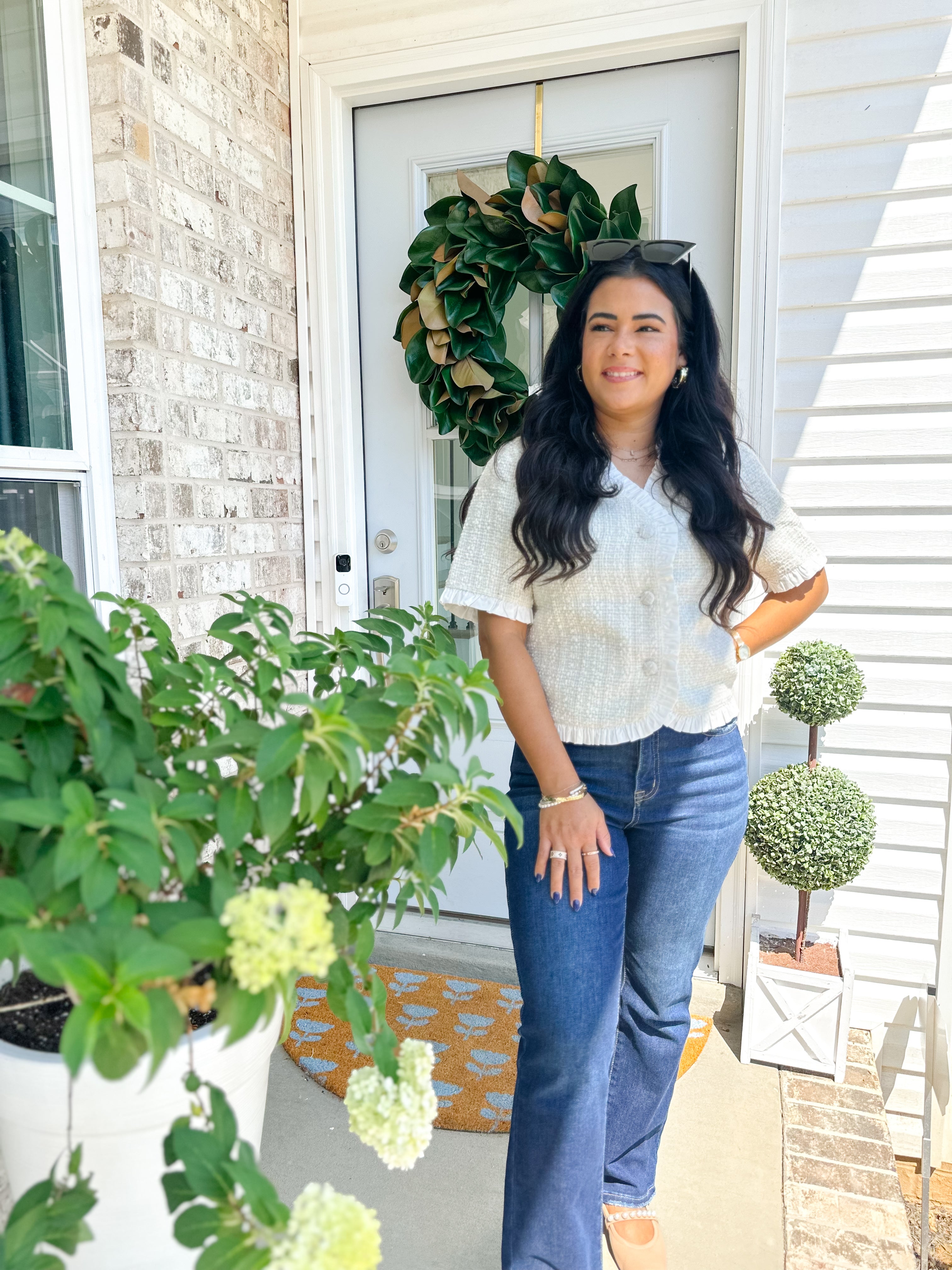 The Jackie Tweed Jacket is your go-to piece for polished layering. Designed in a timeless white tweed with a playful ruffle hem, this short-sleeve jacket is equally refined and versatile. Pair it with tailored denim, layer it over a dress, or wear it open for a chic, effortless look that feels at home from brunch to boardroom.