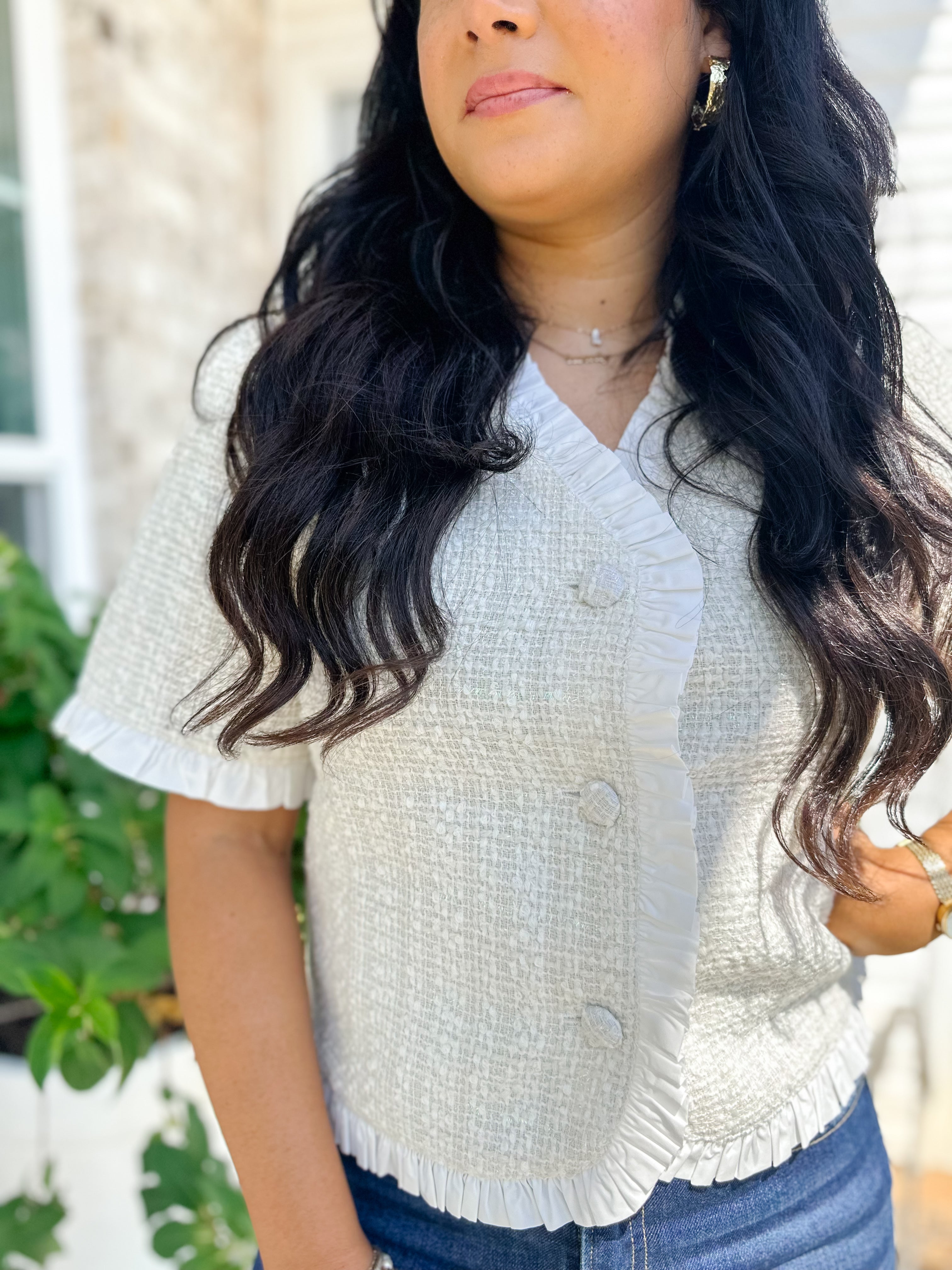 The Jackie Tweed Jacket is your go-to piece for polished layering. Designed in a timeless white tweed with a playful ruffle hem, this short-sleeve jacket is equally refined and versatile. Pair it with tailored denim, layer it over a dress, or wear it open for a chic, effortless look that feels at home from brunch to boardroom.-