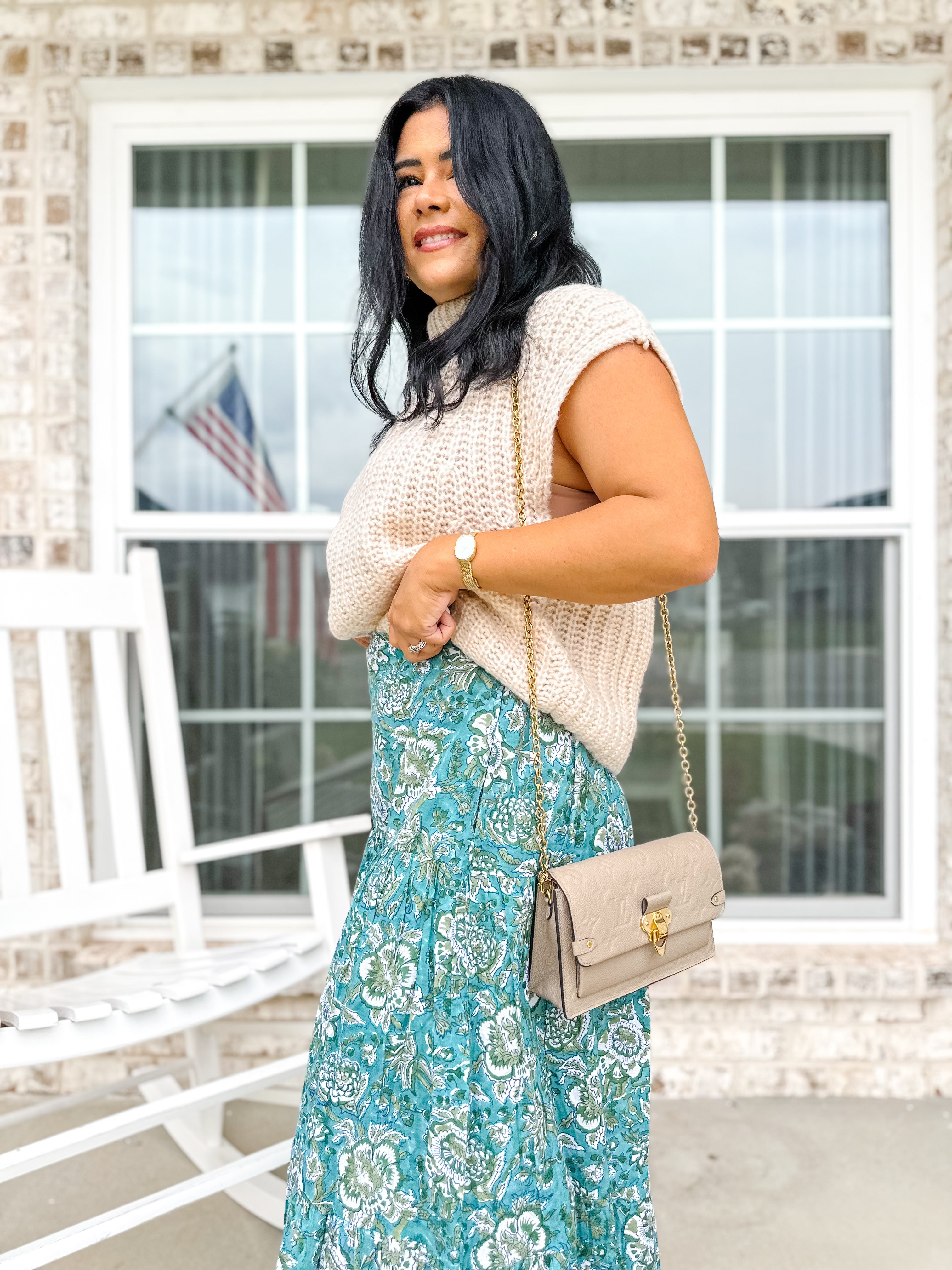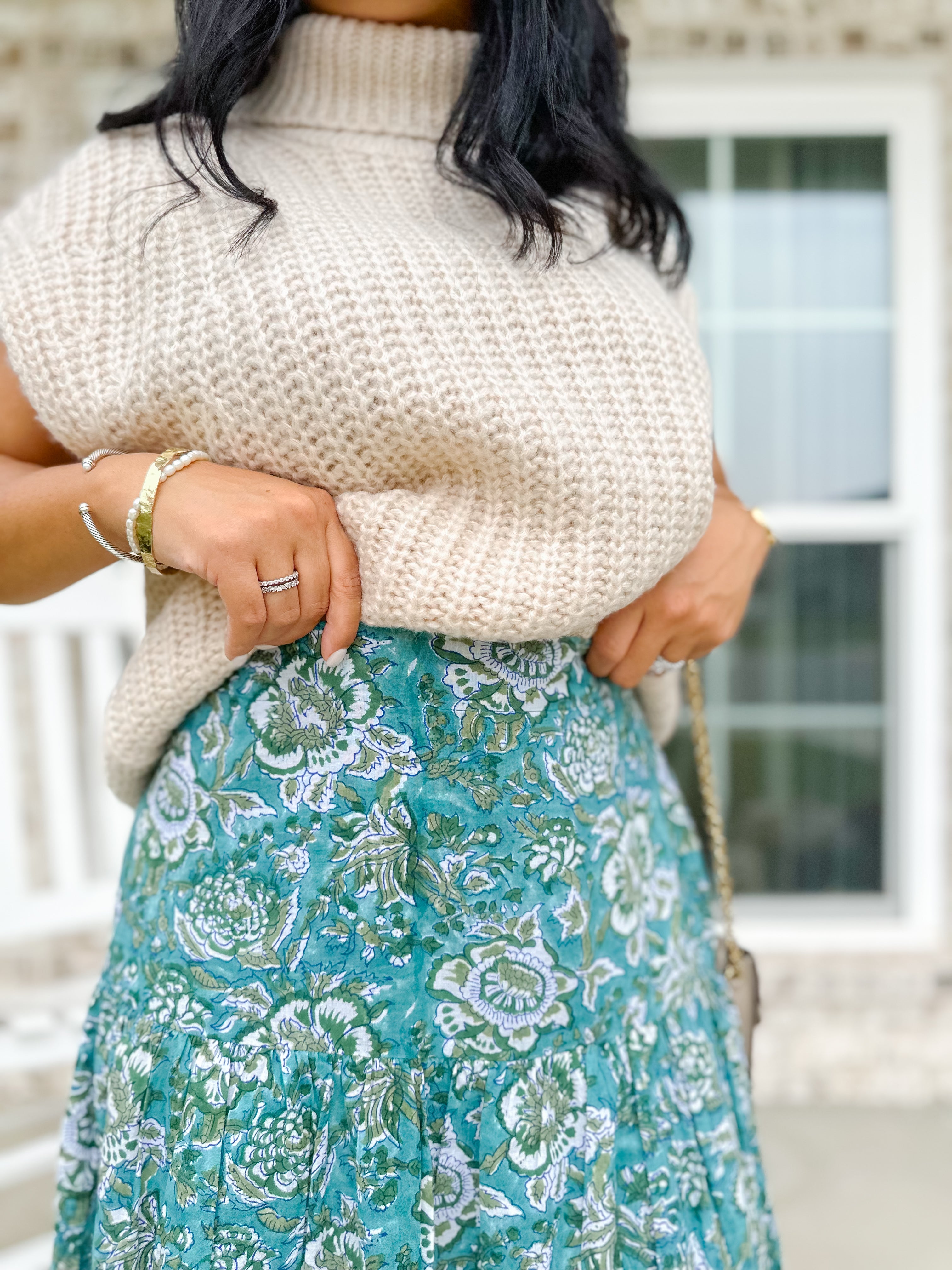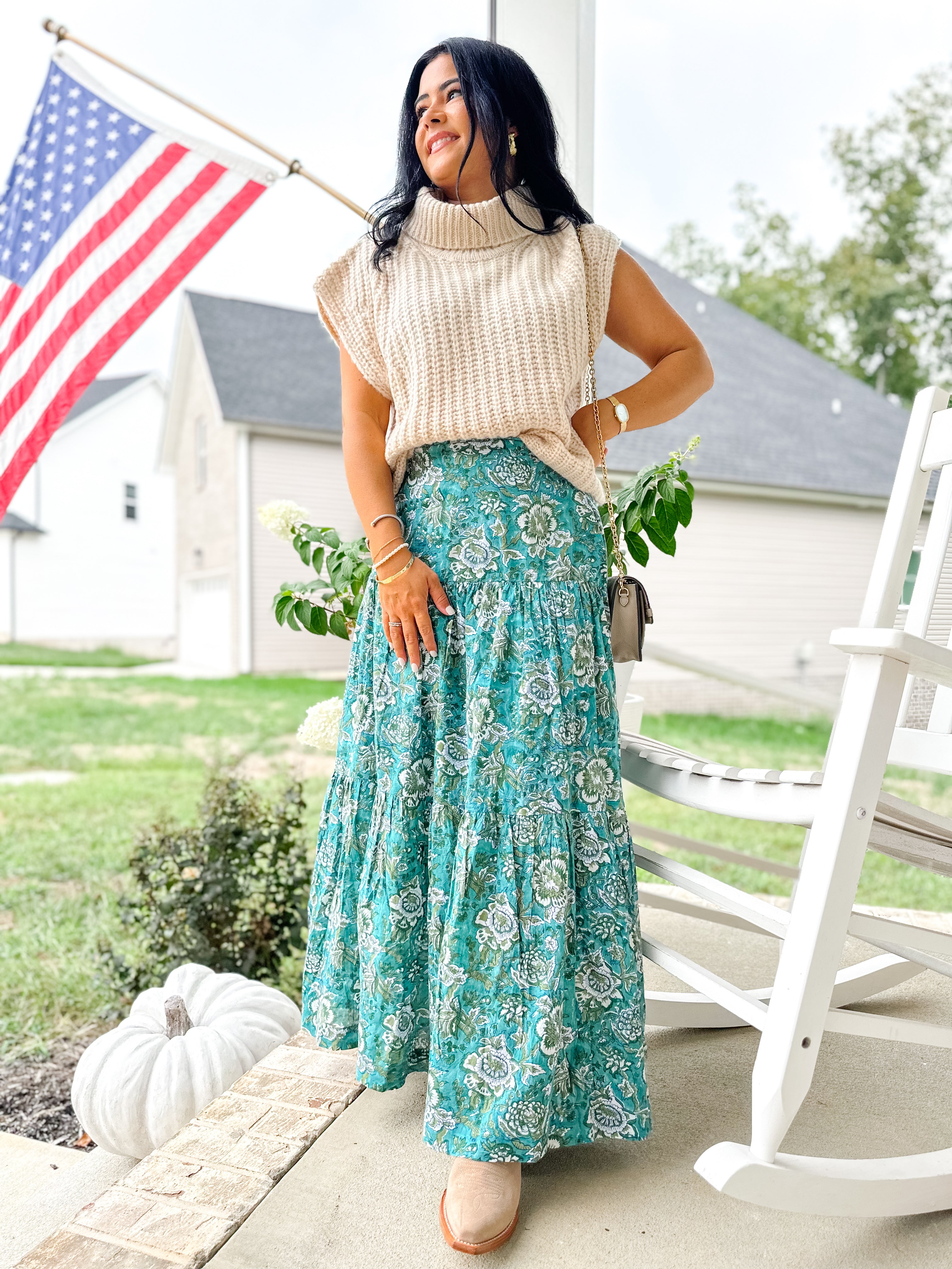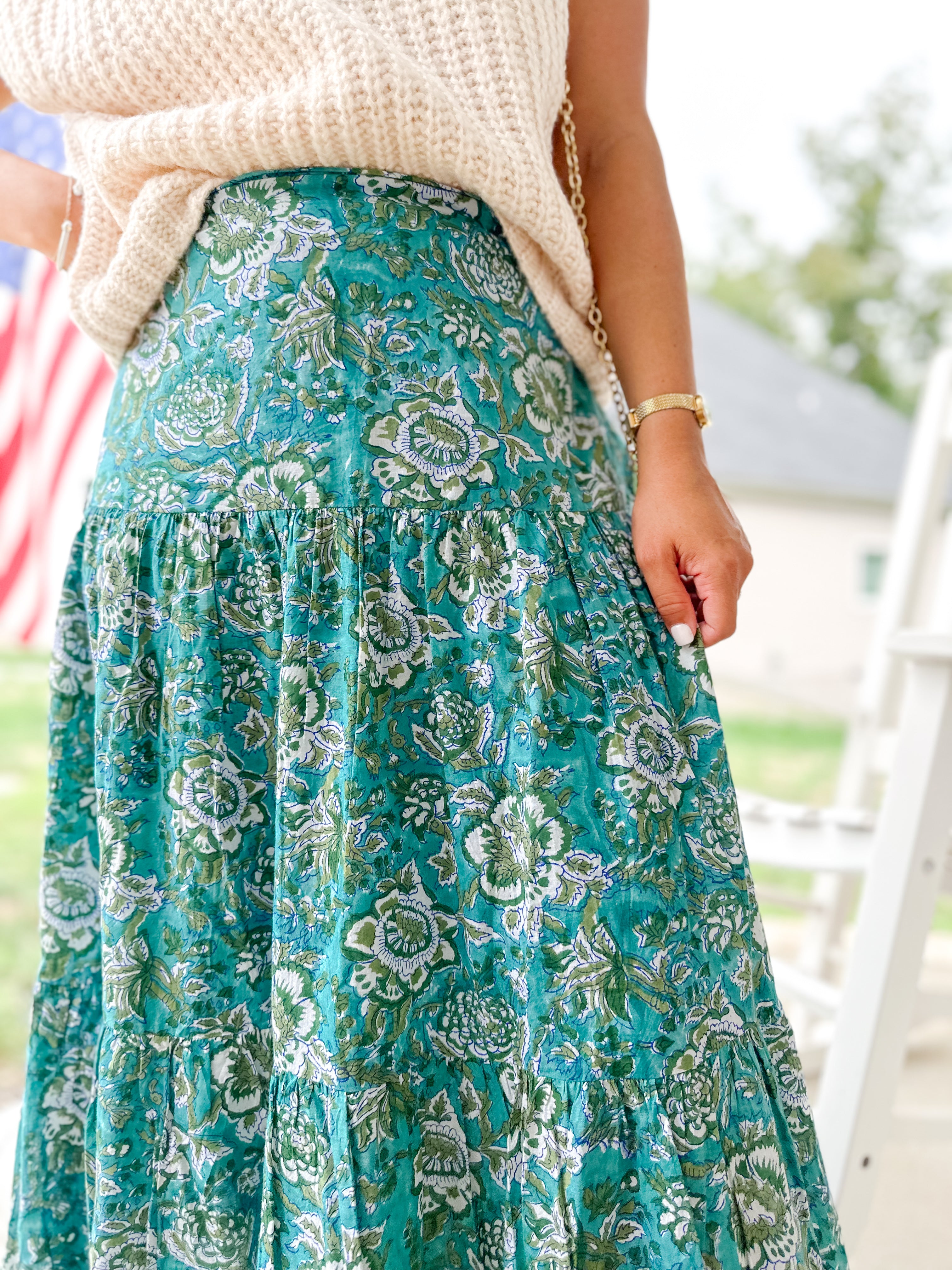 This teal and ivory block-printed tiered skirt flows with ease and charm. Designed with an elastic waist, side pockets, and a fully lined silhouette, it’s perfect for pairing with knits and boots in fall or sandals and blouses come spring.