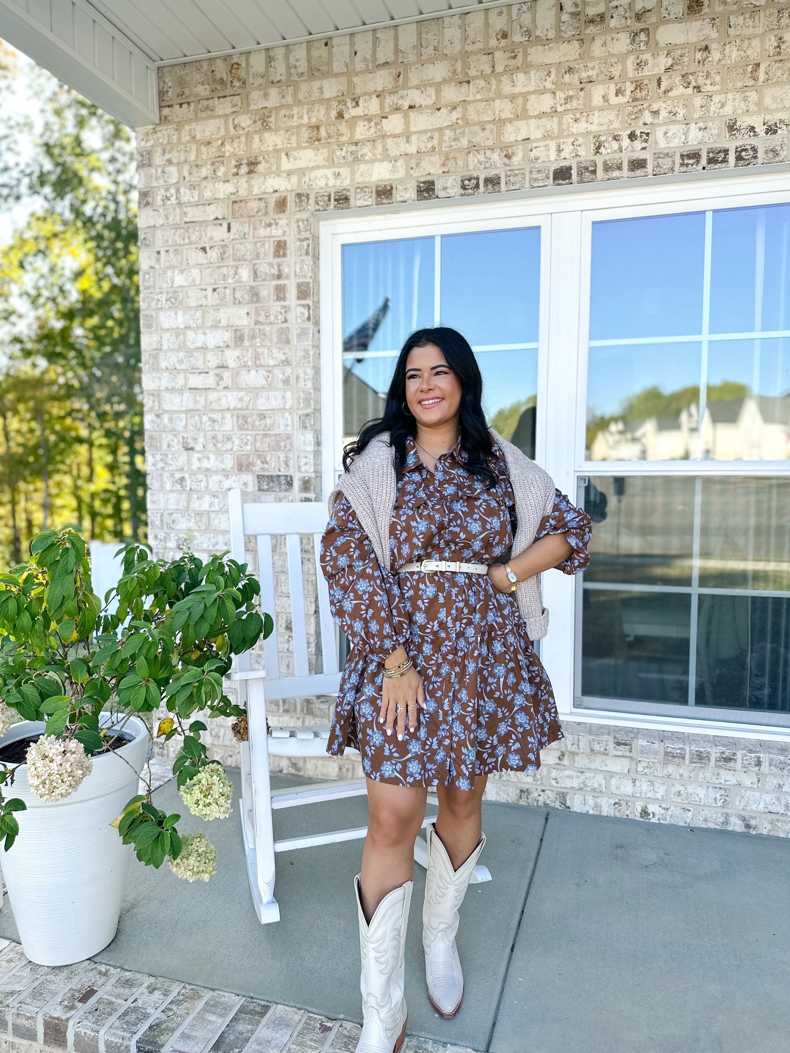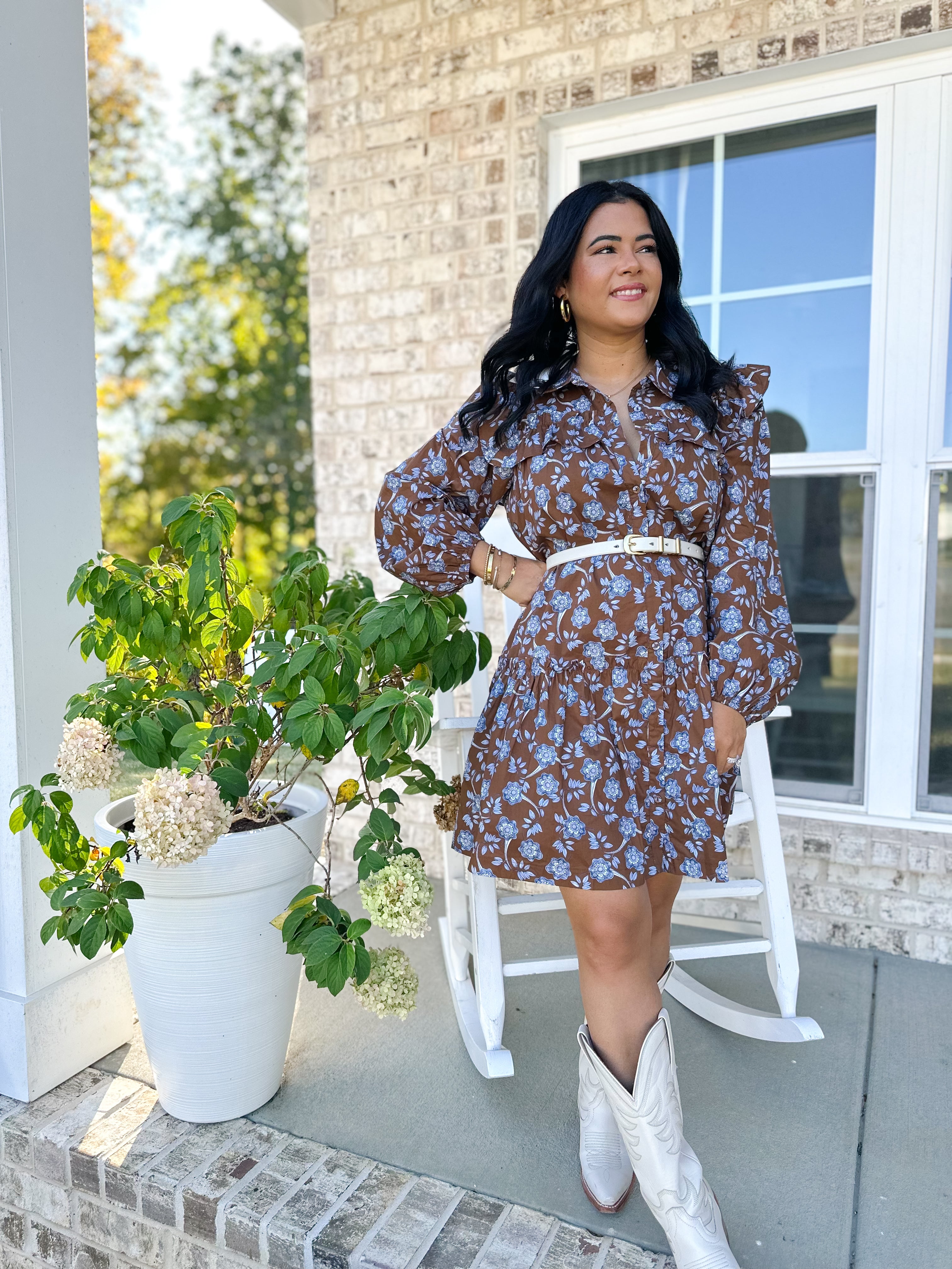 Romantic, refined, and endlessly flattering — The Fairhaven Dress brings soft movement and vintage-inspired charm to your autumn wardrobe. Designed in a chestnut floral print with a collared neckline, button front, and ruffled trim, it’s the kind of dress that feels equally at home with boots or heels. The belted waist and drop hem silhouette give it a timeless, feminine shape you’ll reach for again and again.