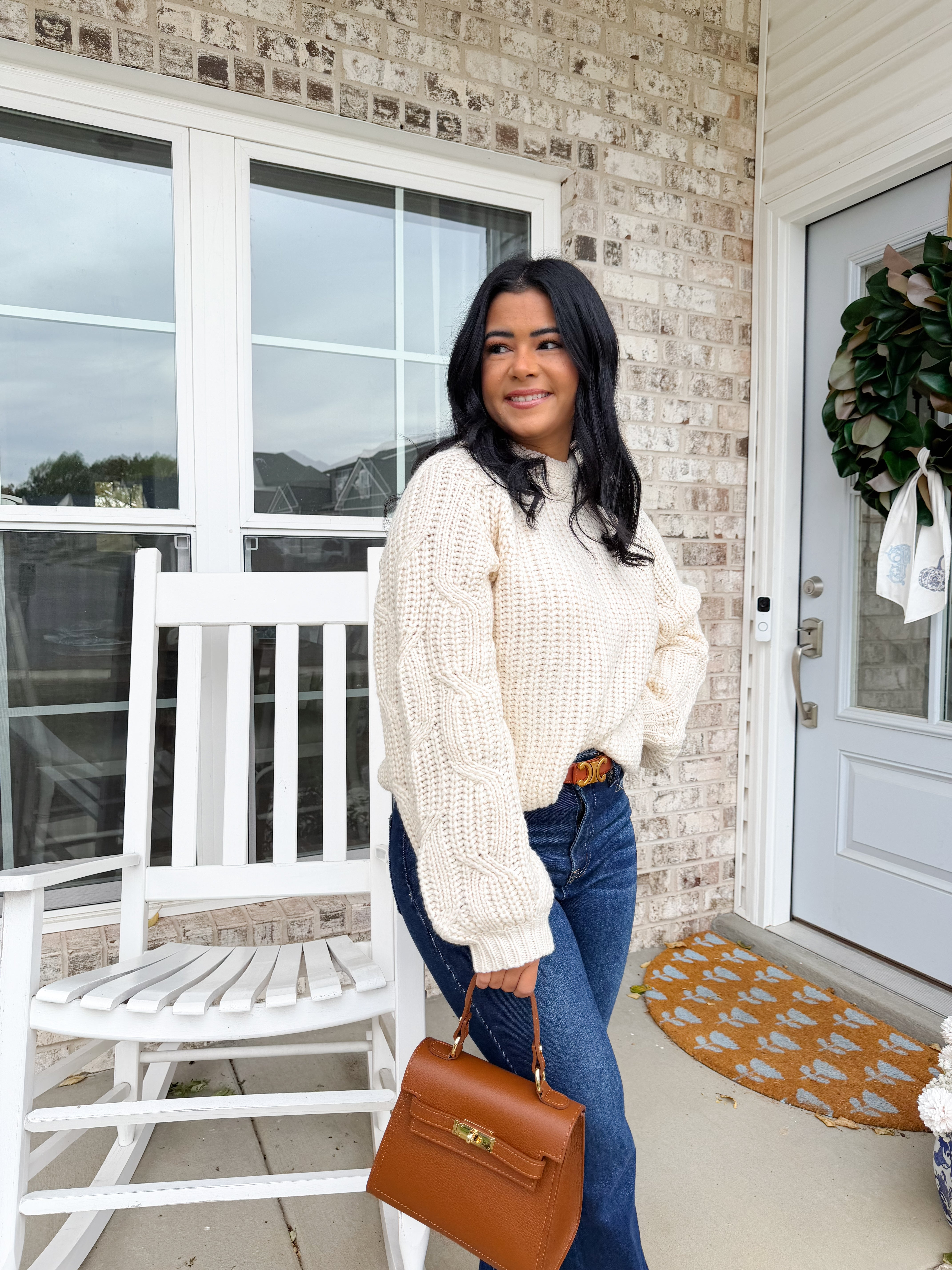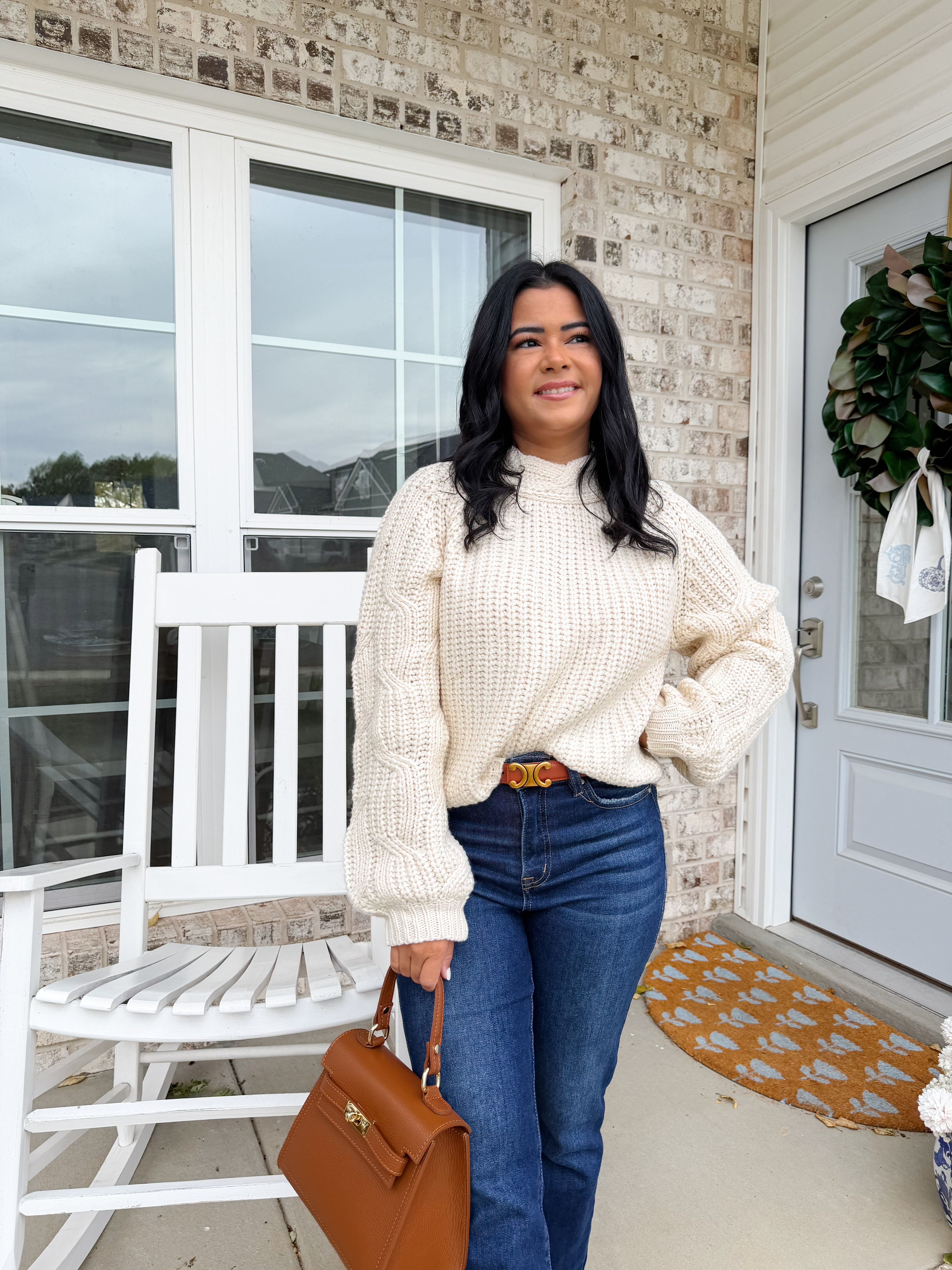 The Fireside Cable Sweater features lantern sleeves and soft cable details that add warmth and character without feeling heavy. It’s the perfect cool-weather knit for mornings on the porch, family gatherings, or holiday errands.