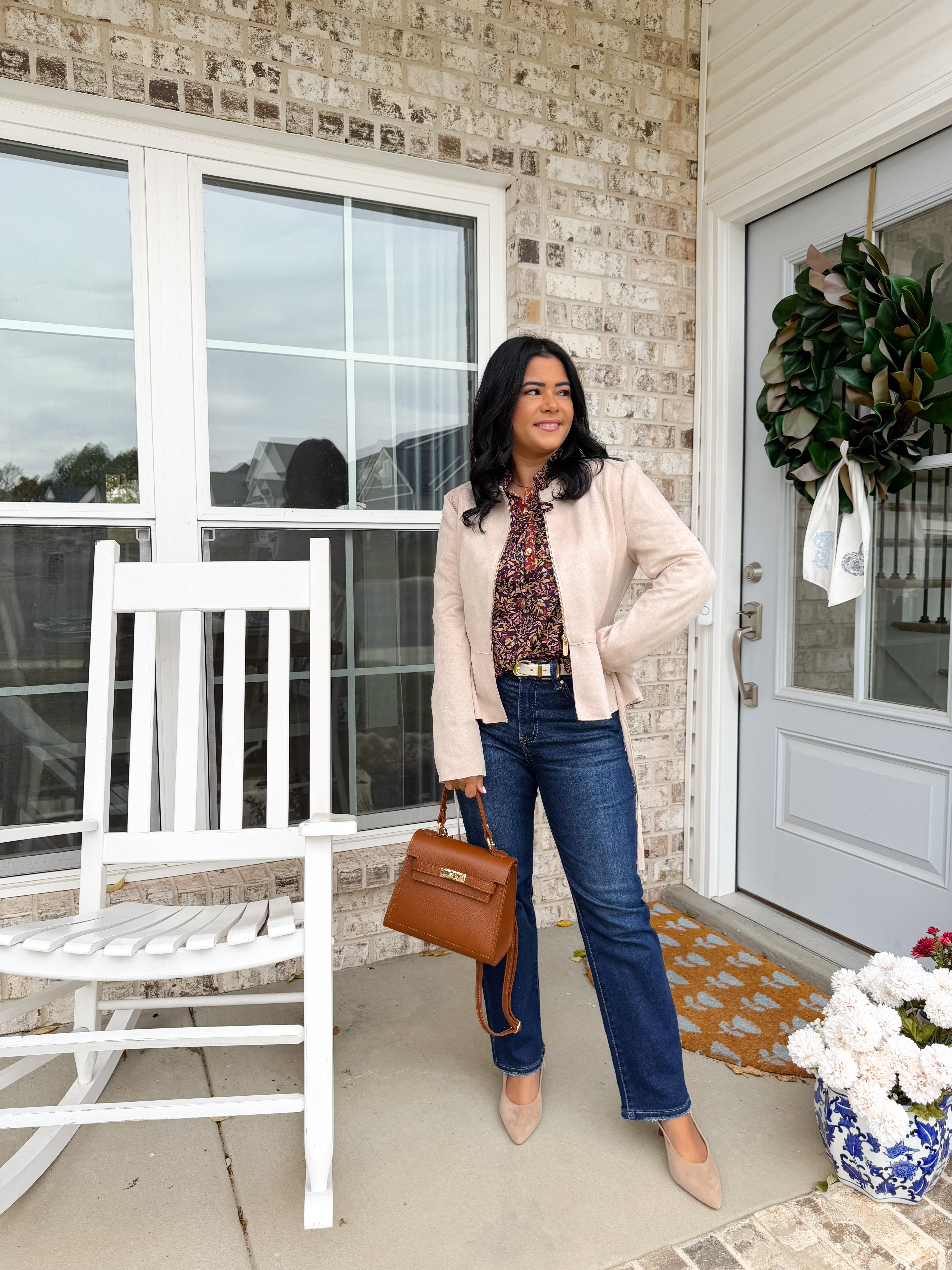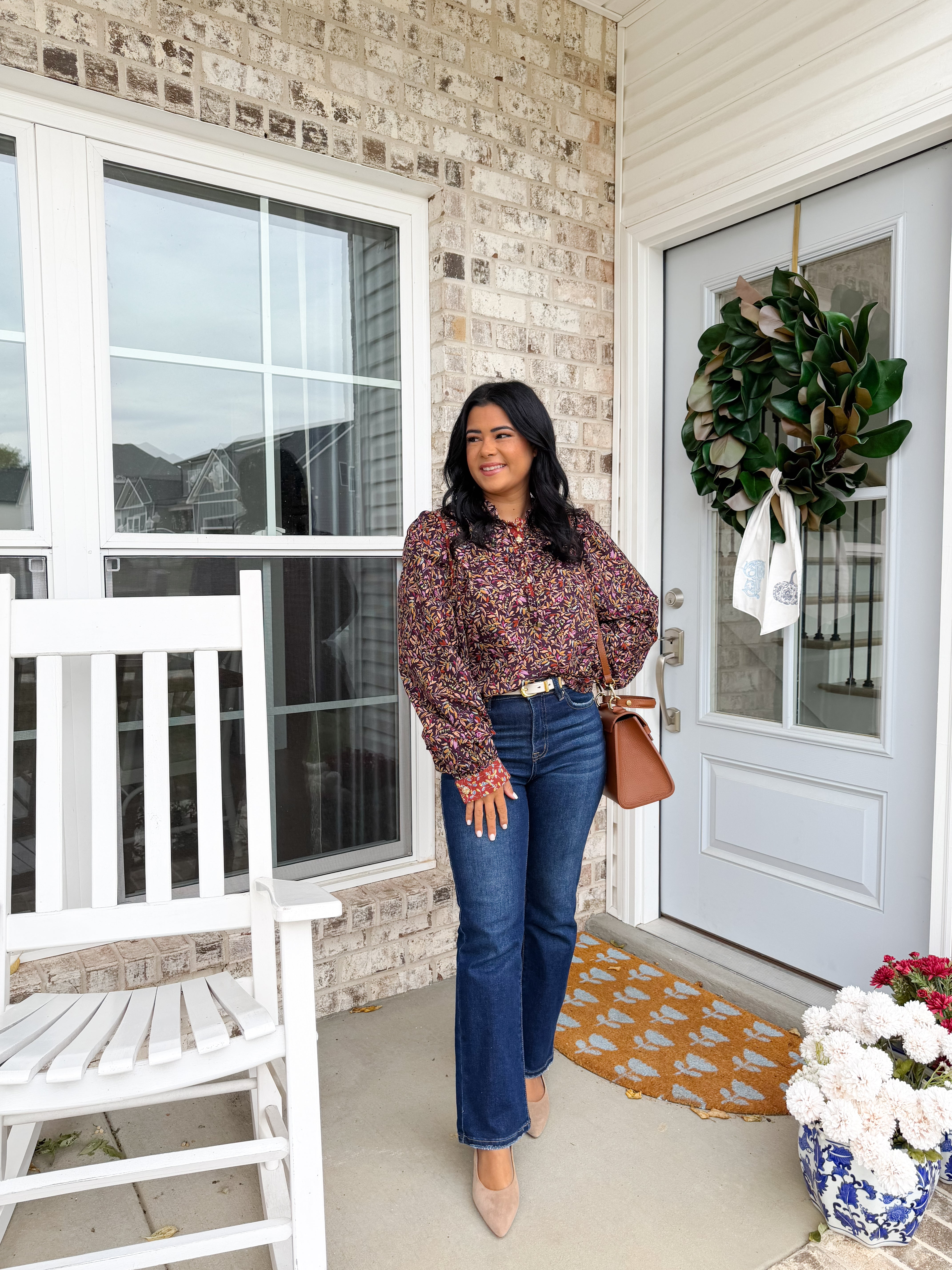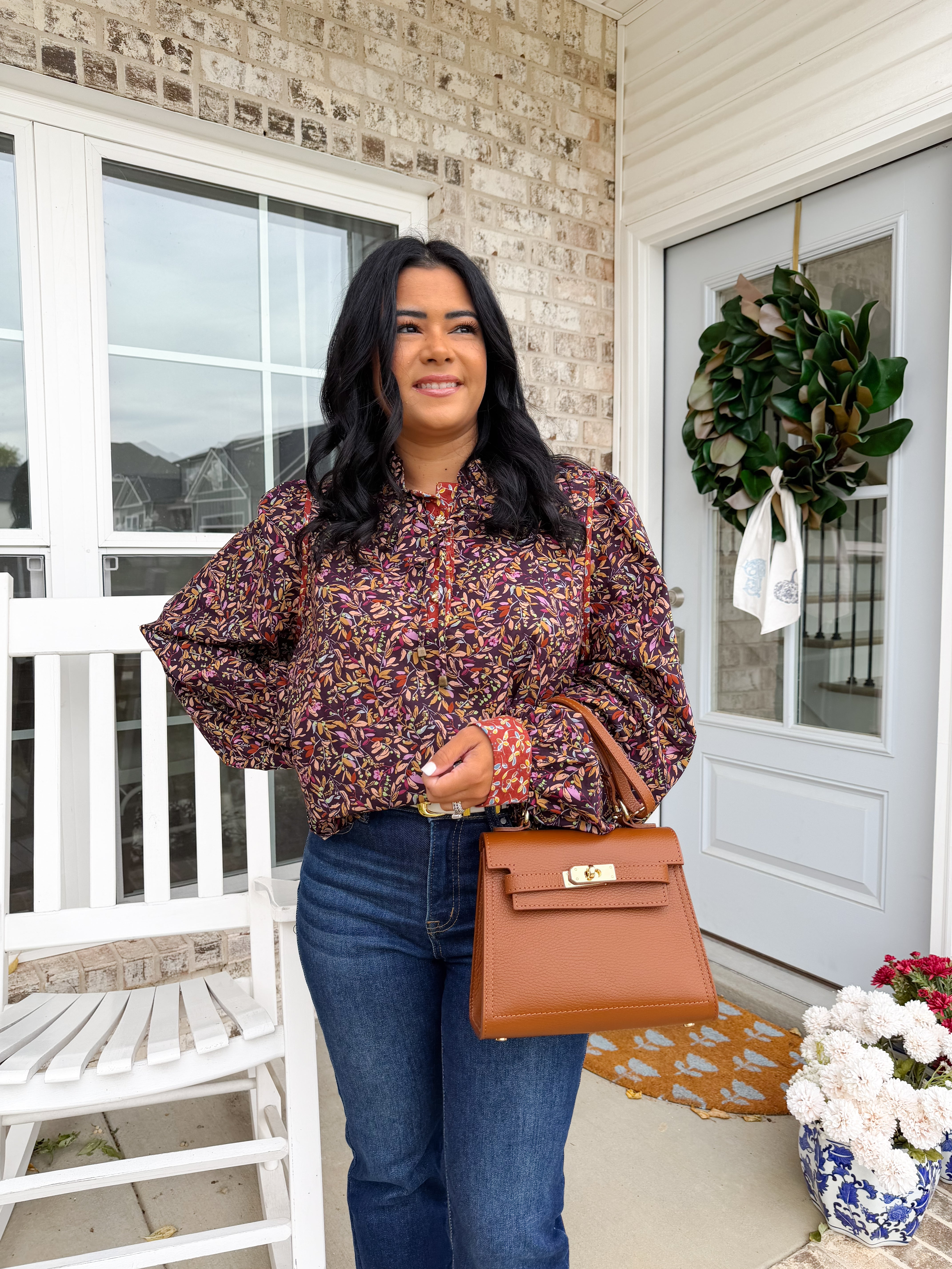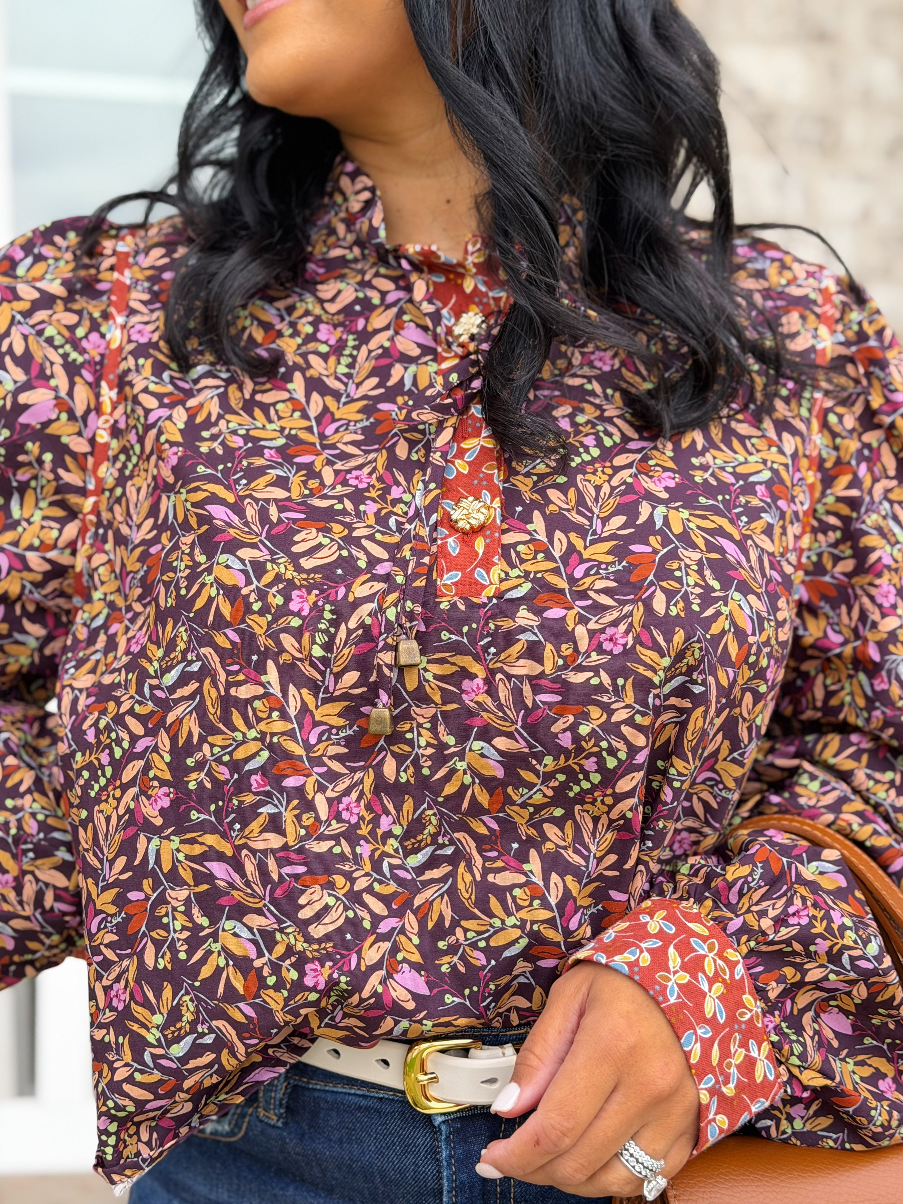 The Harvest Bloom Blouse features a romantic leaf print in warm autumn tones. The relaxed shape drapes beautifully and the band collar detail adds a subtle, polished touch. A lightweight piece that pairs perfectly with denim, trousers, or holiday skirts.