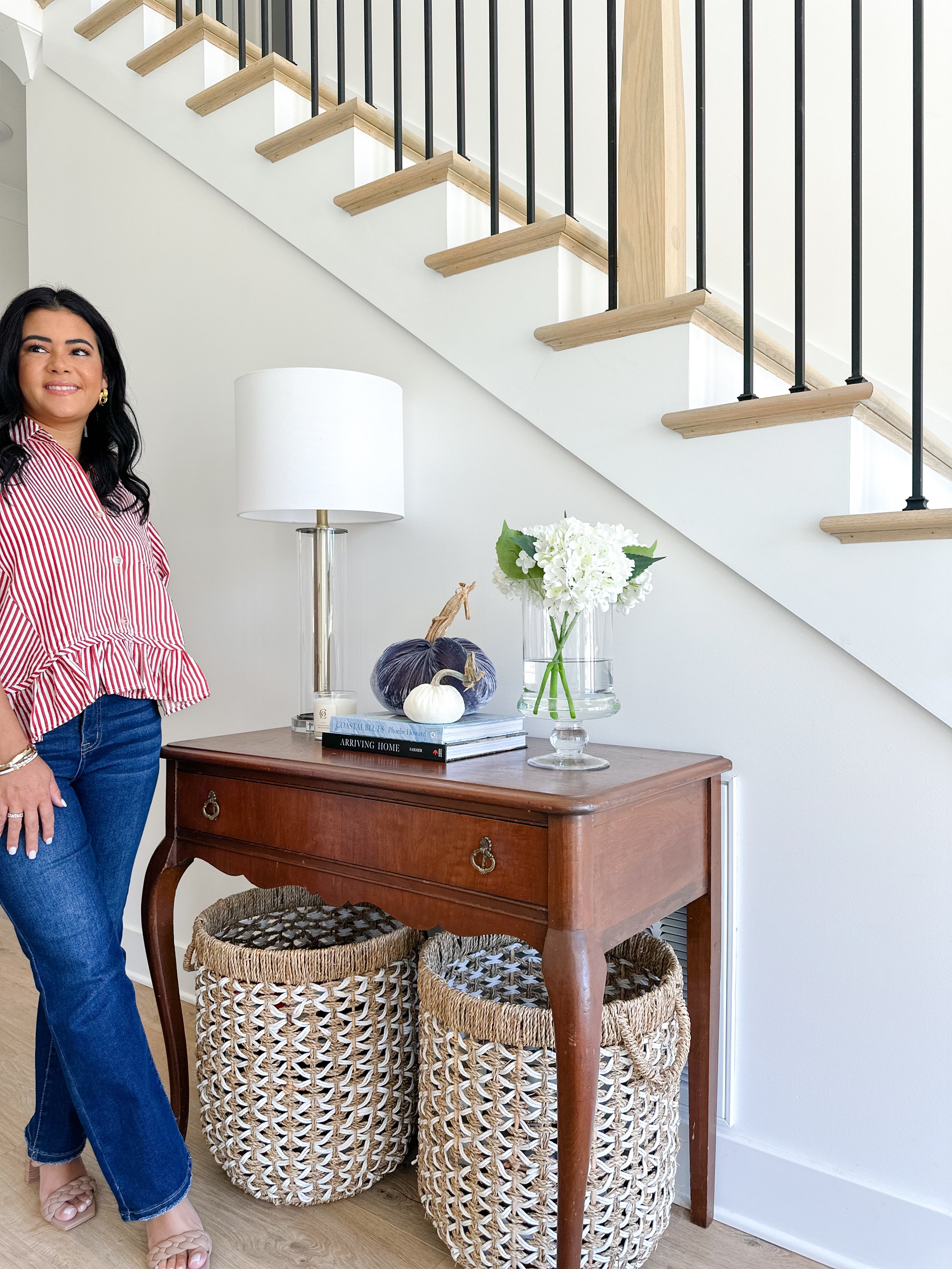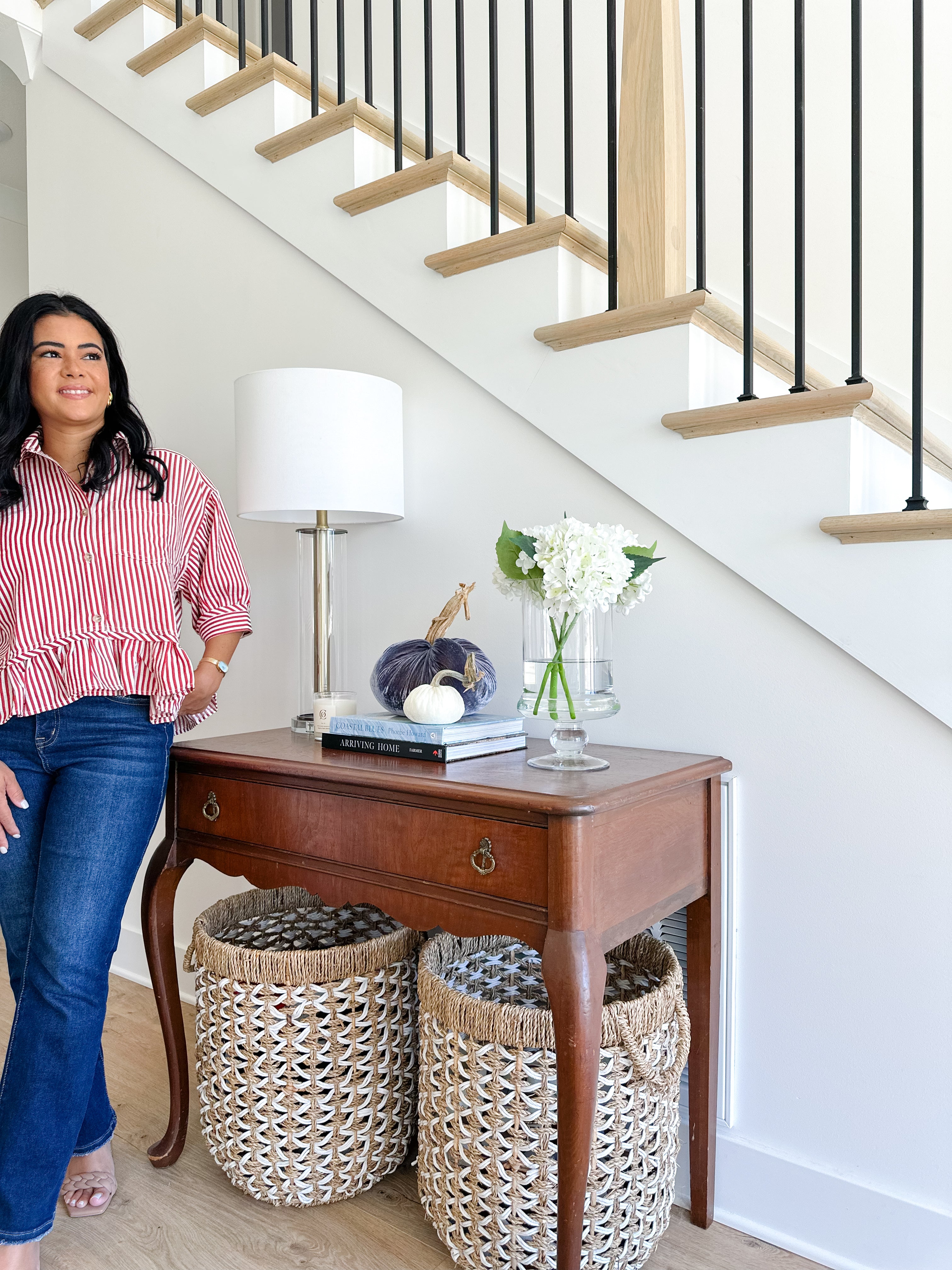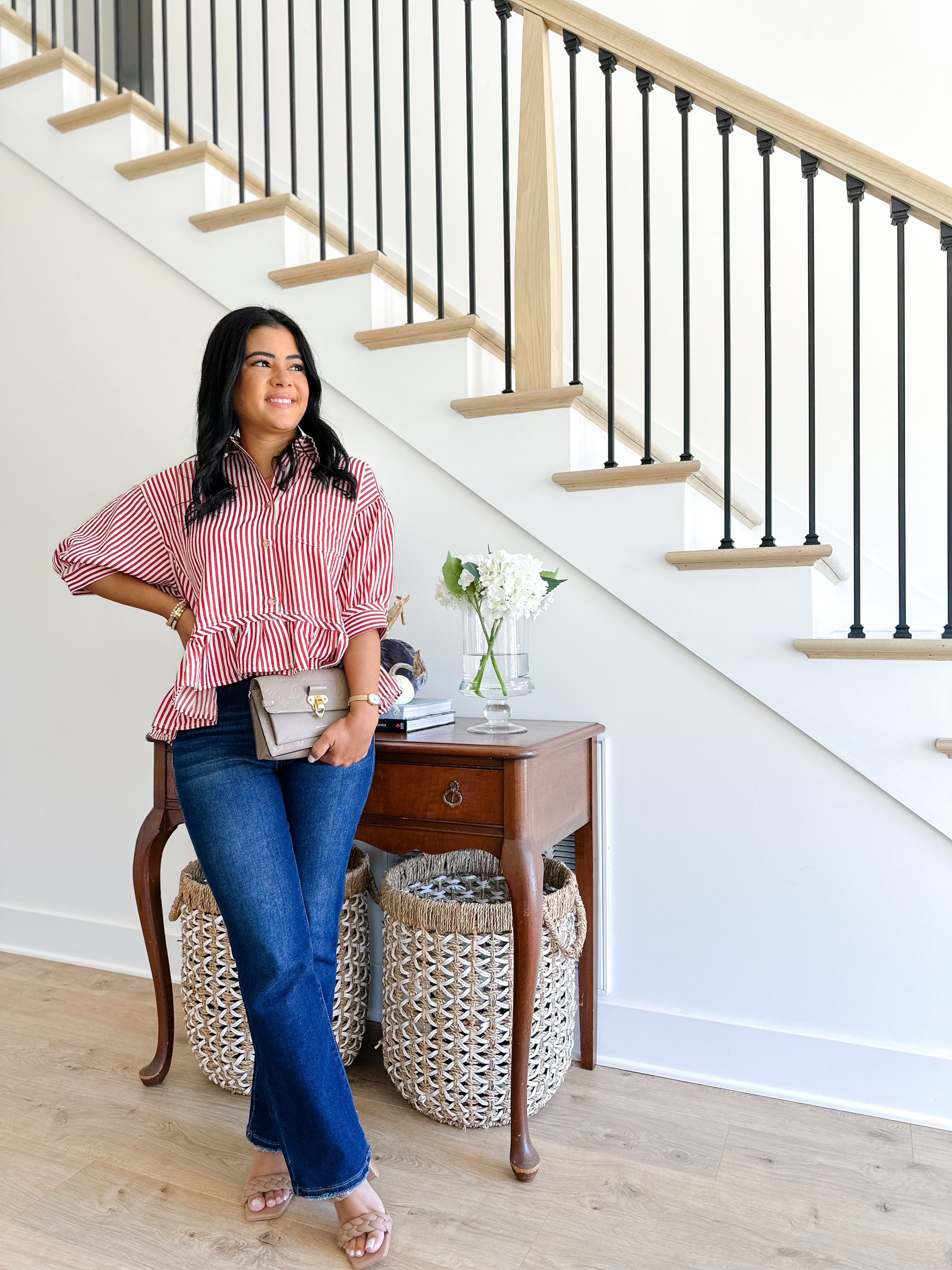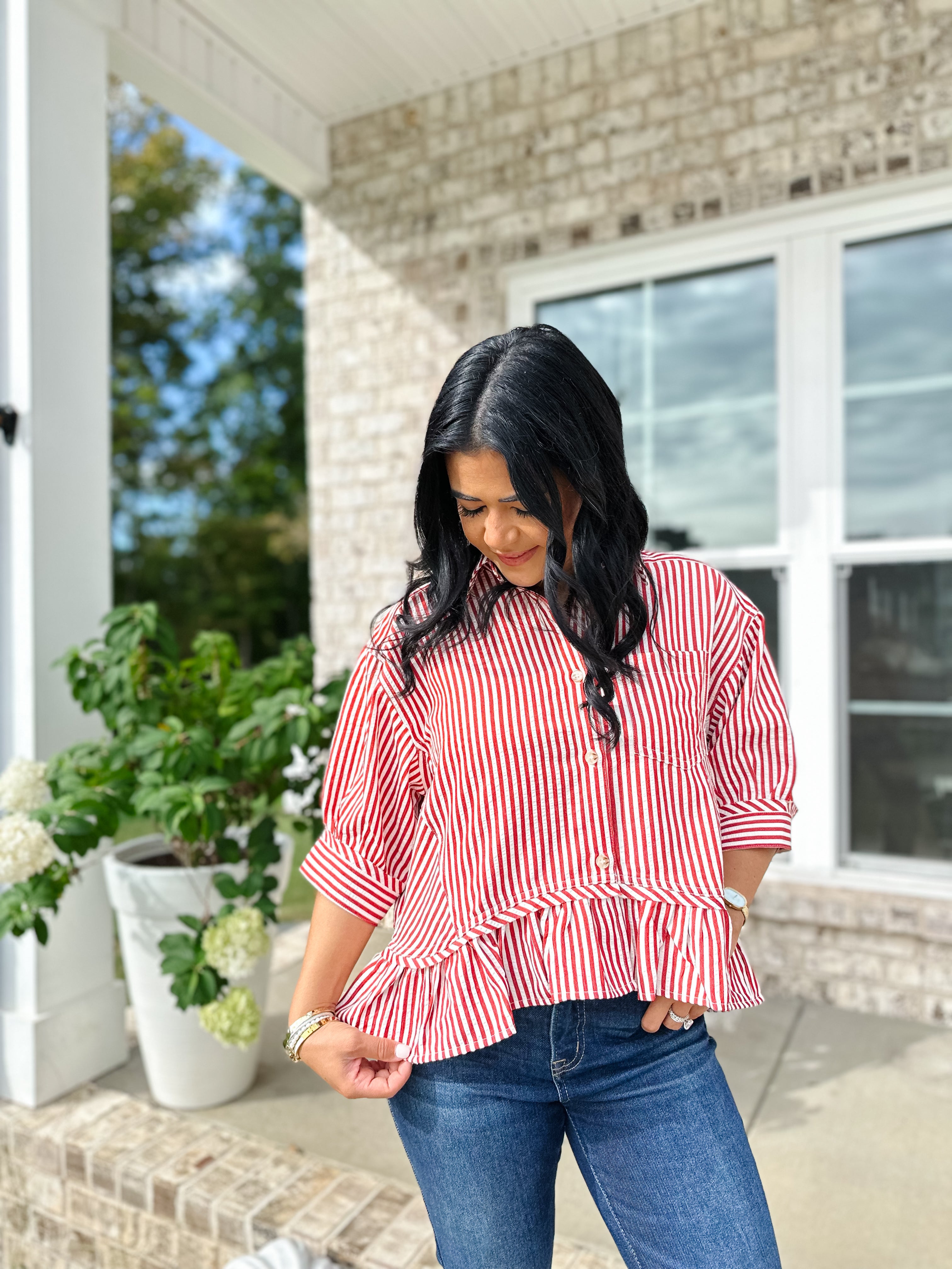 The Sweet Home Top captures classic charm with a hint of playful detail. Designed with ¾ sleeves, a stripe cuff band, and a ruffle hem, it feels refined yet effortless. Wear it tucked into denim for a laid-back look or layered under a jacket for cooler days.