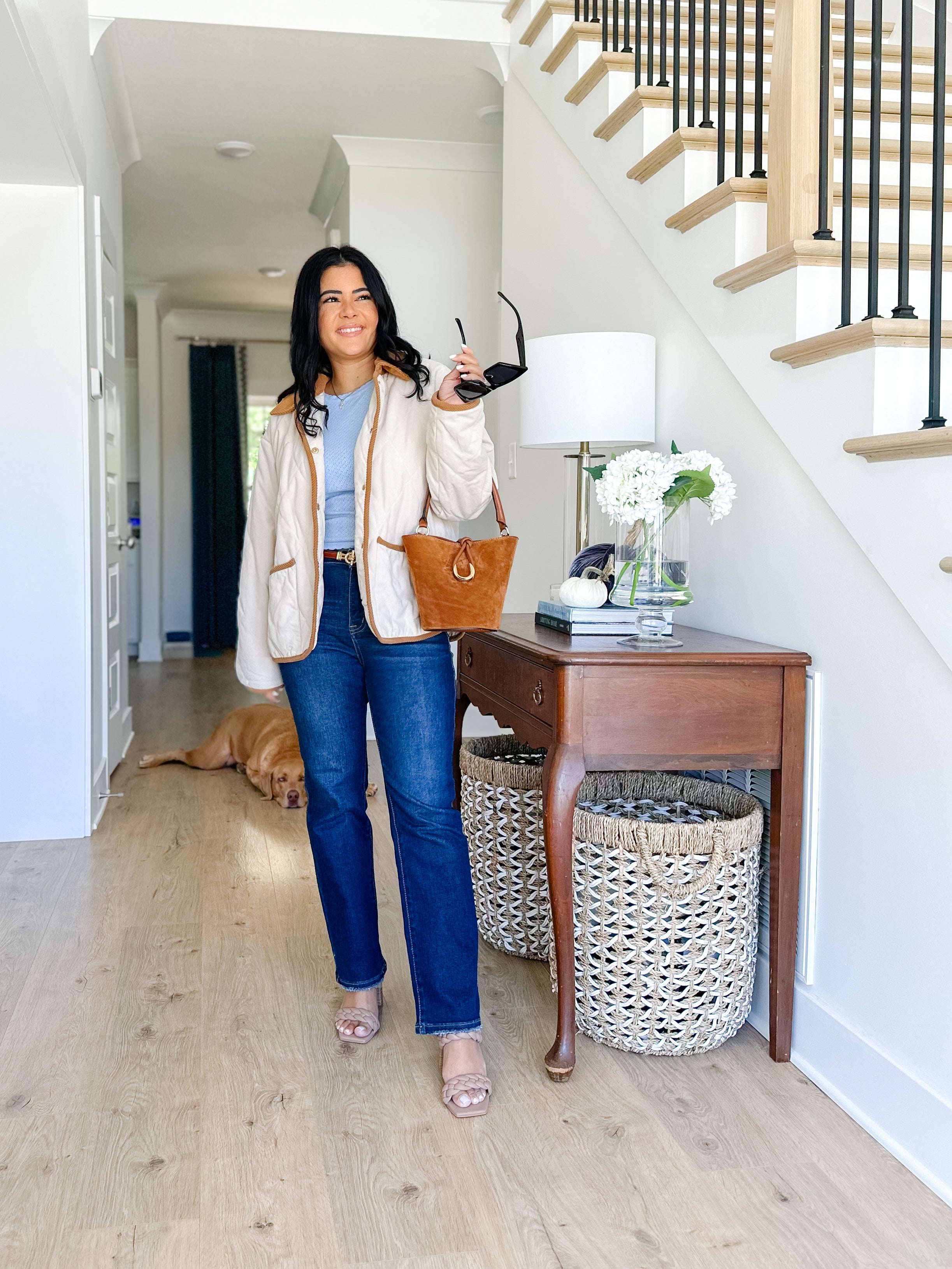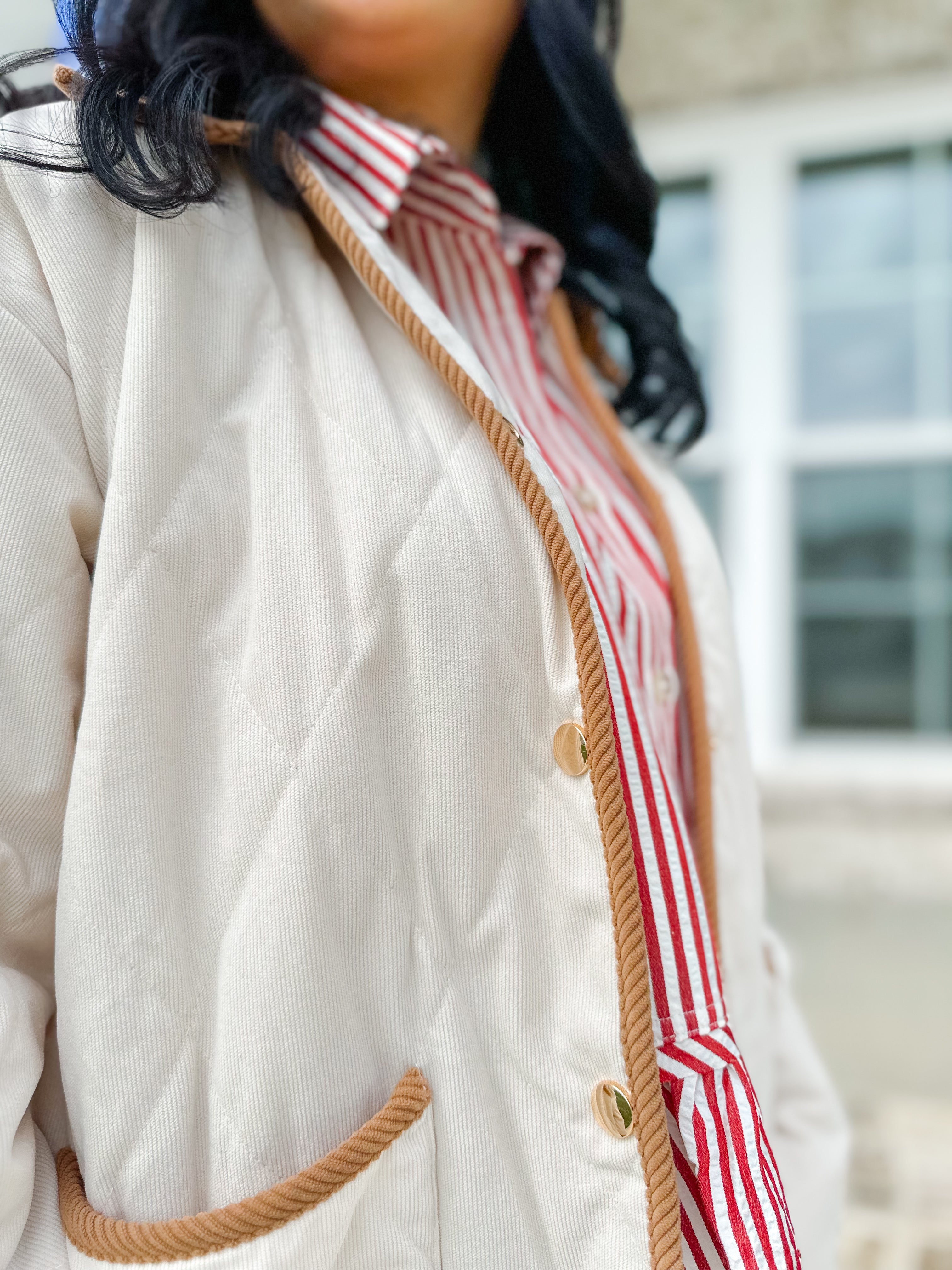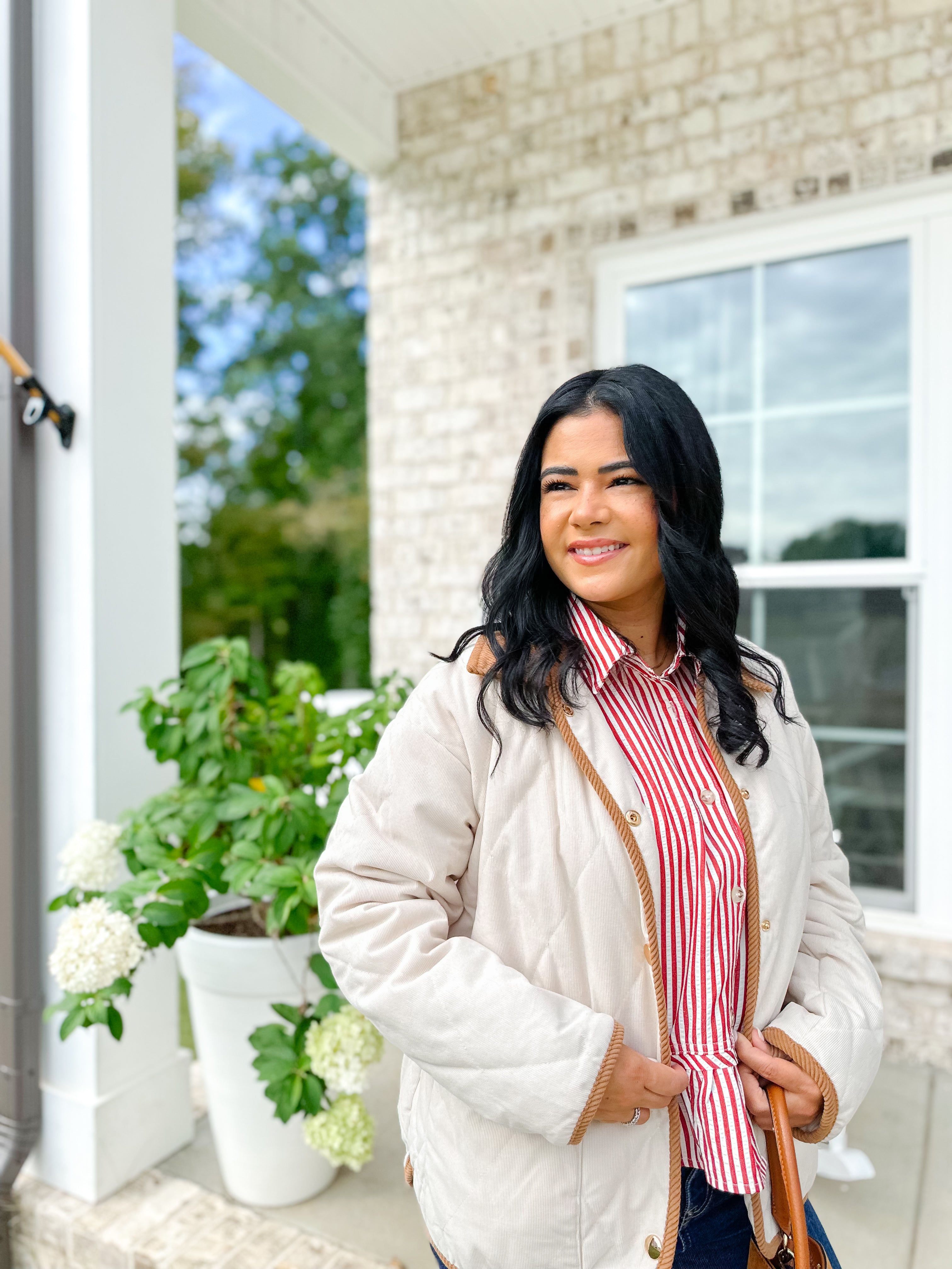 The Carmichael Jacket is a lightweight quilted layer with a modern Southern twist. Its diamond pattern quilting, contrast collar, and binding detail make it versatile enough for everyday errands, polished dinners, or travel days.