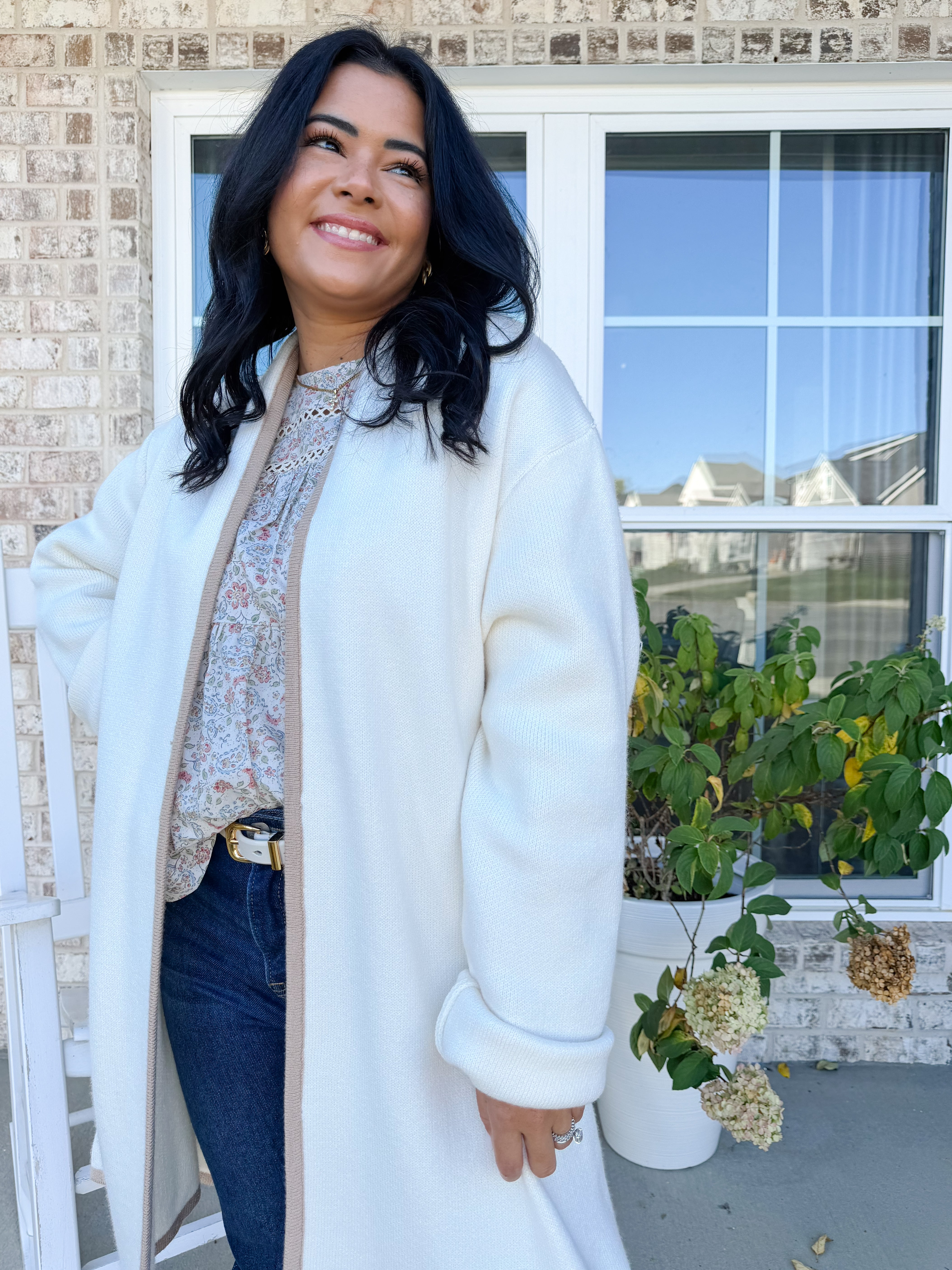 The Blair Cardigan is the definition of cozy elegance. Its cream knit body paired with soft taupe trim creates a refined, effortless look that elevates even the simplest outfit. Lightweight enough for daily wear, yet warm enough for crisp porch mornings, this is the piece you’ll reach for again and again.