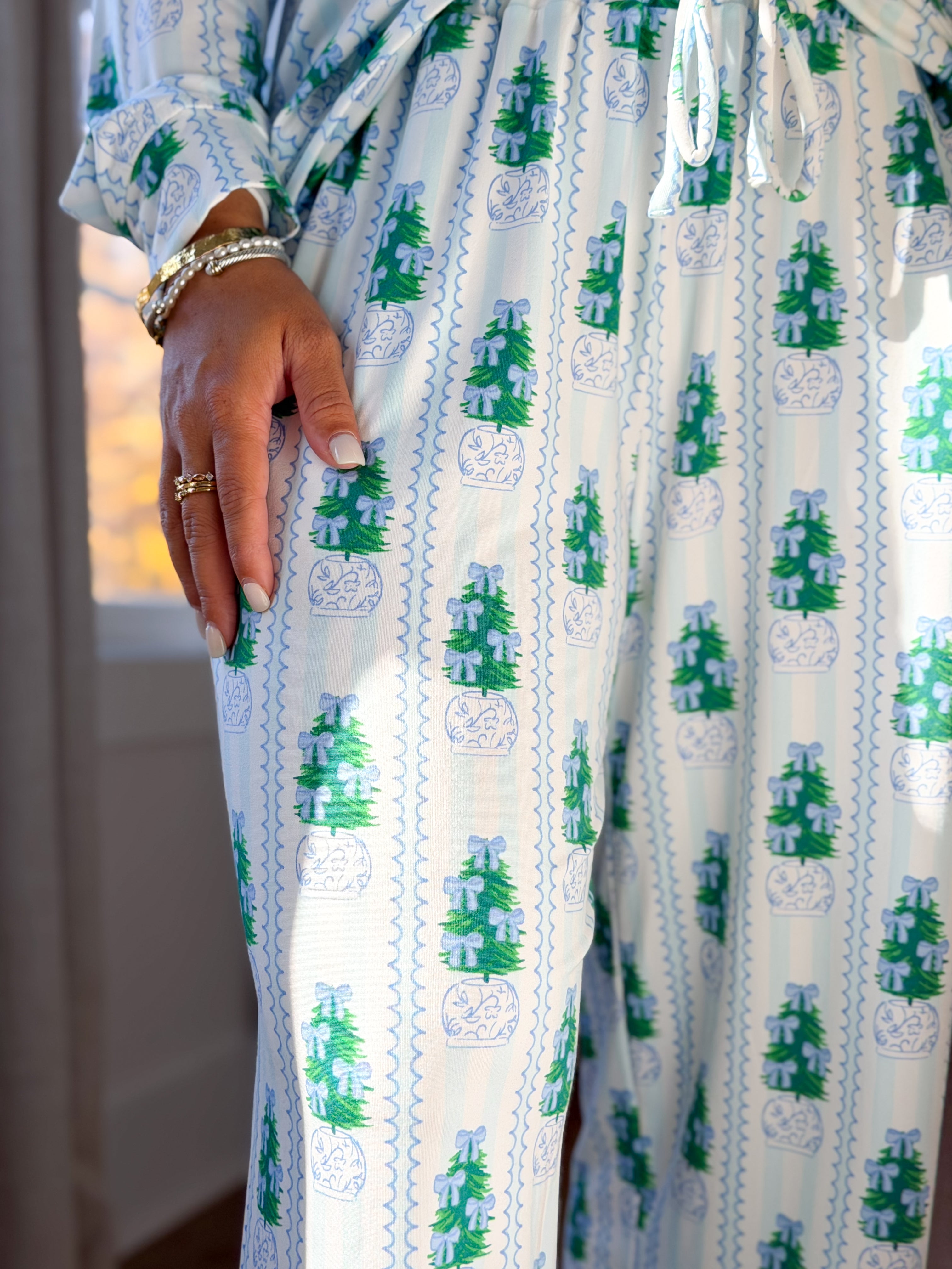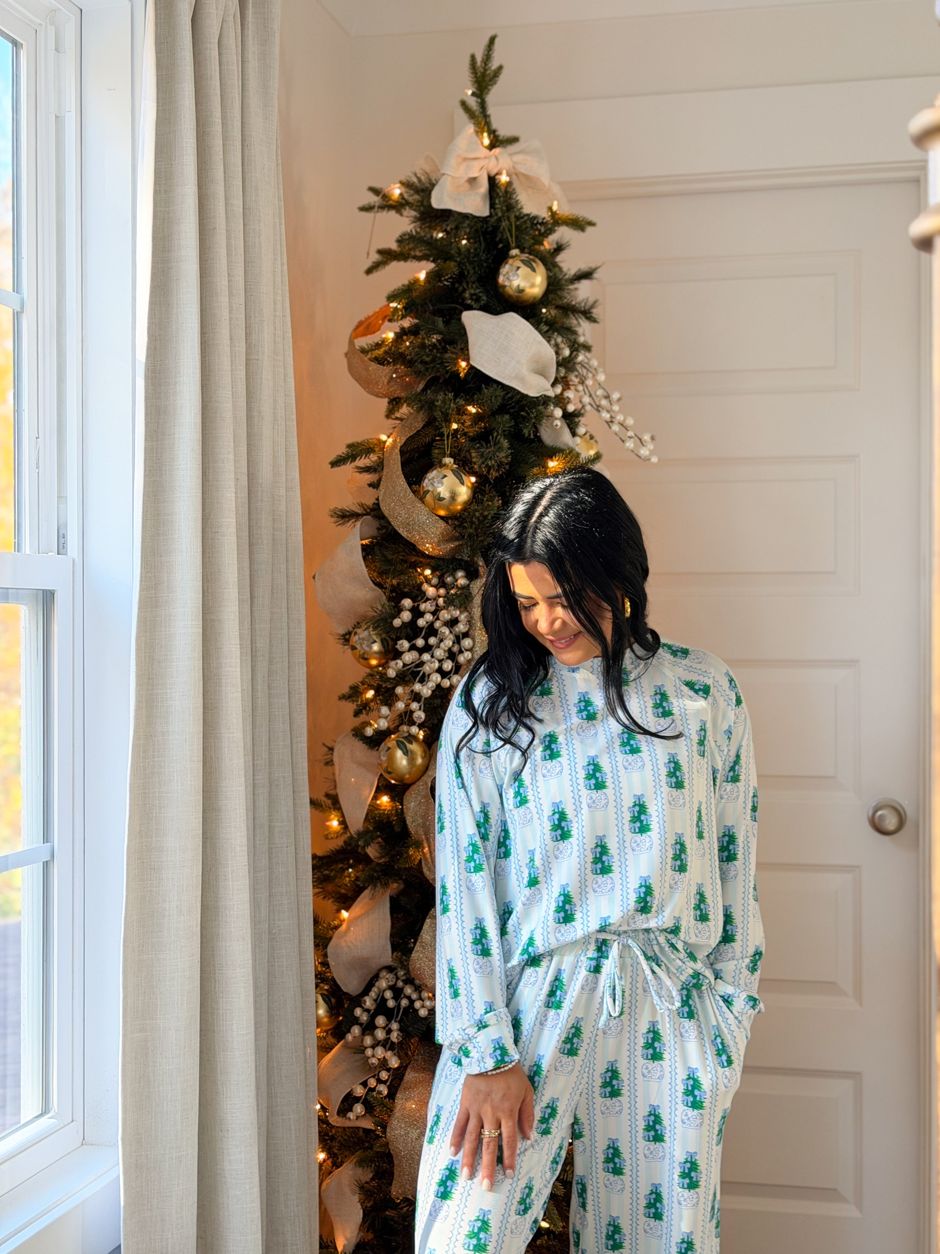 The Chinoiserie Christmas Pajama Set feels like slipping into a cloud. The fabric is silky-soft and stretchy, and the print is pure Southern charm—wreaths, greenery, and tiny Christmas trees set inside blue & white ginger jars. It’s the grandmillennial holiday pajama dreams are made of.