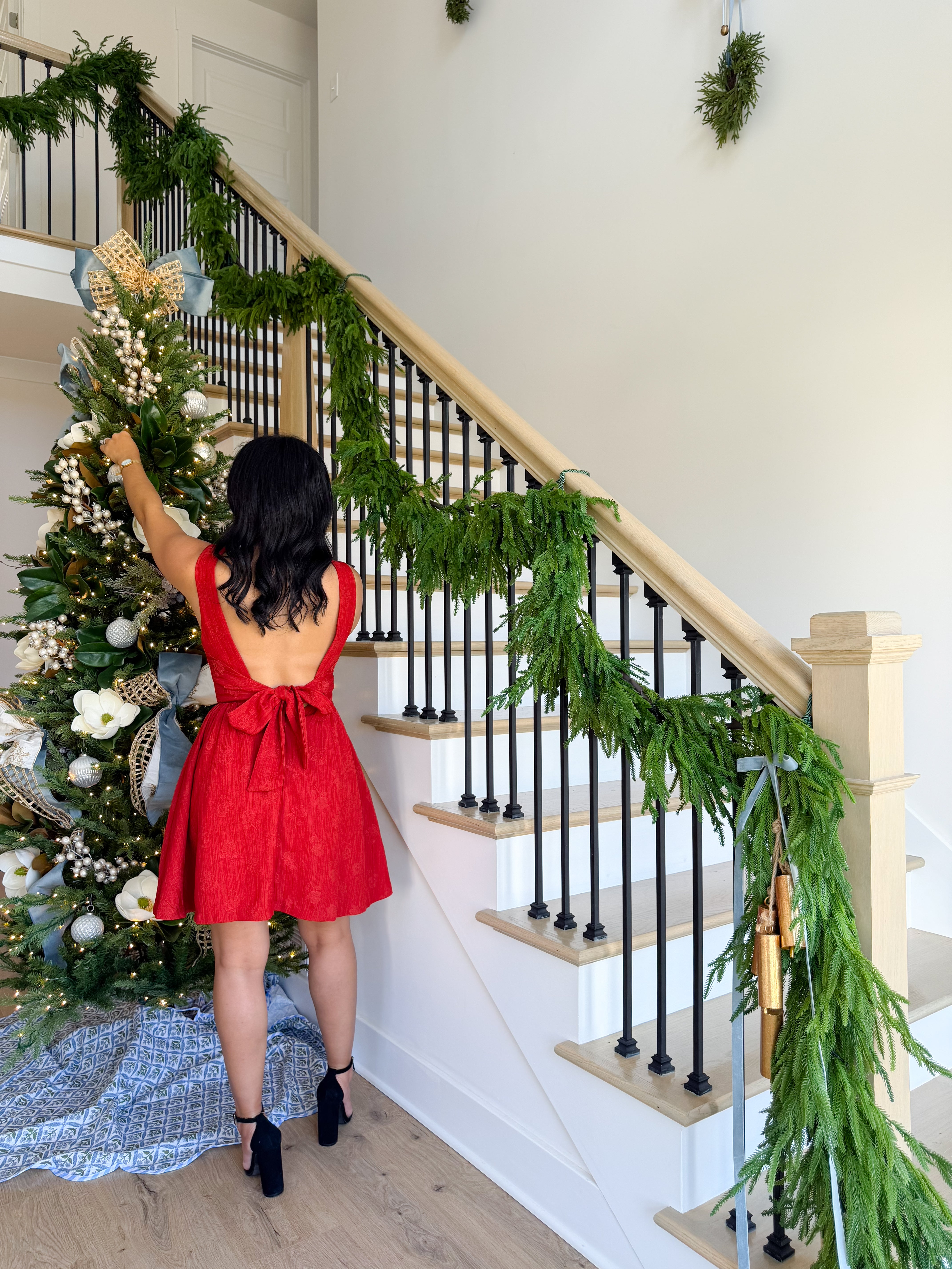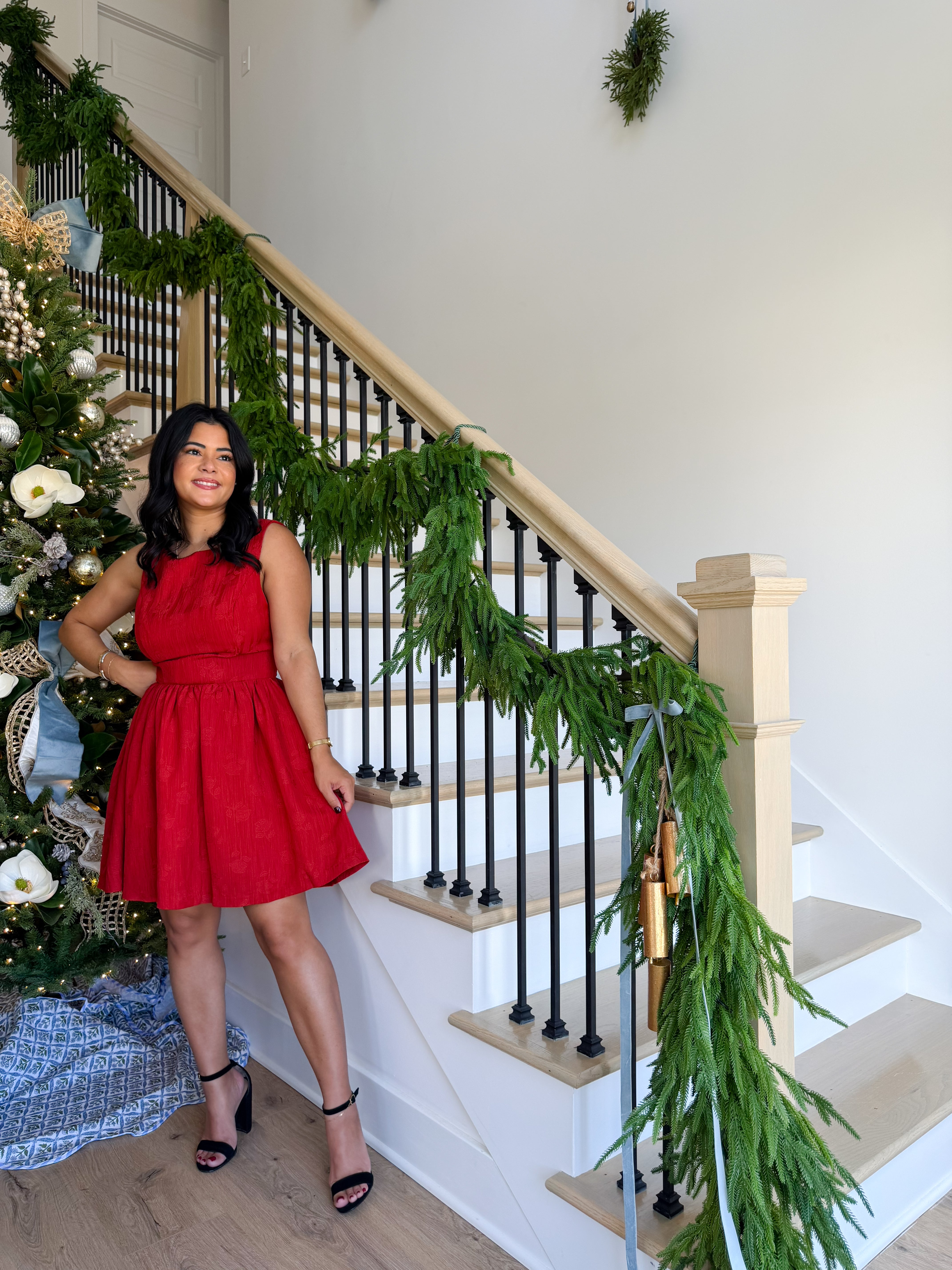 The Mistletoe Bow-Back Dress is equal parts festive and elegant. The tonal jacquard texture adds quiet luxury, while the dramatic low scoop back and oversized bow give it that unforgettable “wow” moment. With its fit-and-flare silhouette and full lining, it’s comfortable enough for long evenings and special celebrations.
